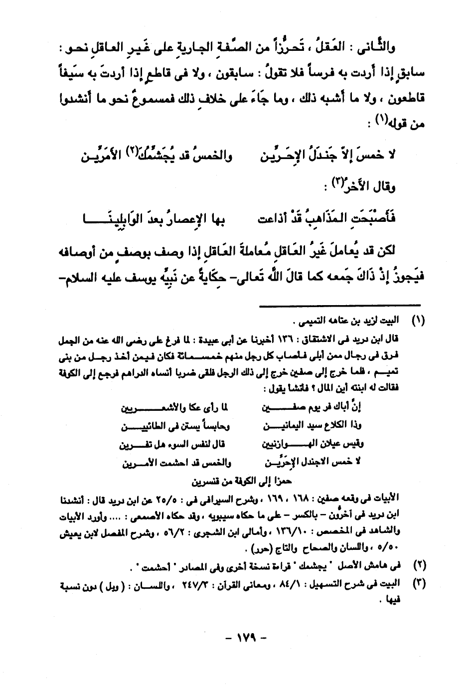 والثاني: العقل، تحرزا من الصفة الجارية على غير العاقل نحو: سابق إذا أردت به فرسا فلا تقول: سابقون، ولا في قاطع إذا أردت به سيفا قاطعون، ولا ما أشبه ذلك، وما جاء على خلاف ذلك فمسموع نحو ما أنشدوا من قوله: