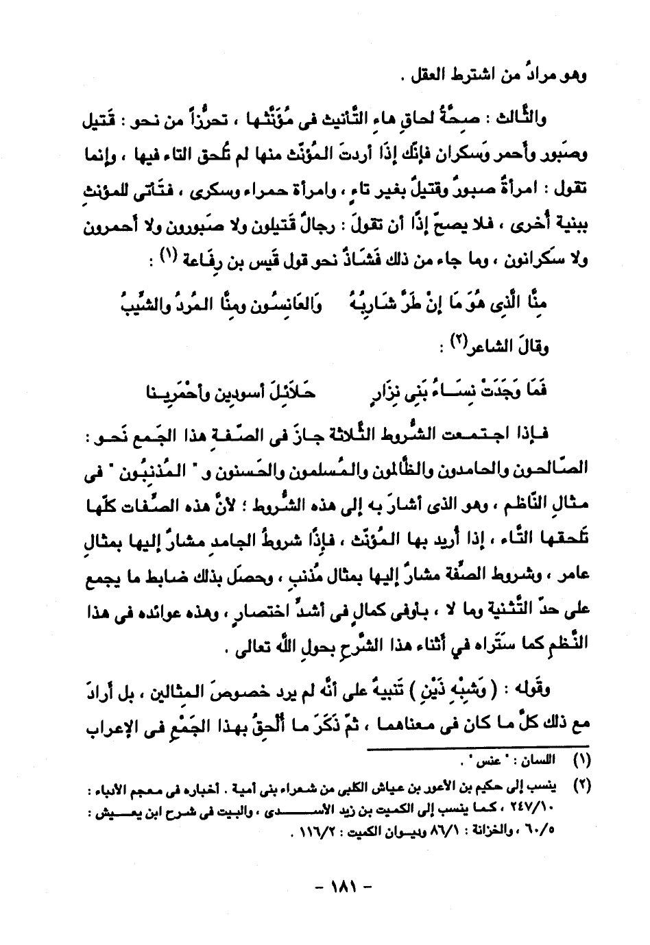 والثالث: صحة لحاق هاء التأنيث في مؤنثها، تحرزا من نحو: قتيل وصبور وأحمر وسكران فإنك أردت المؤنث منها لم تلحق التاء فيها، وإنما تقول: امرأة صبور وقتيل بغير تاء، وامرأة حمراء وسكرى، فتأتي للمؤنث ببنية أخرى، فلا يصح إذ أن تقول: رجال قتيلون ولا صبورون ولا أحمرون ولا سكرانون، وما جاء من ذلك فشاذ نحو قول قيس بن رفاعة: