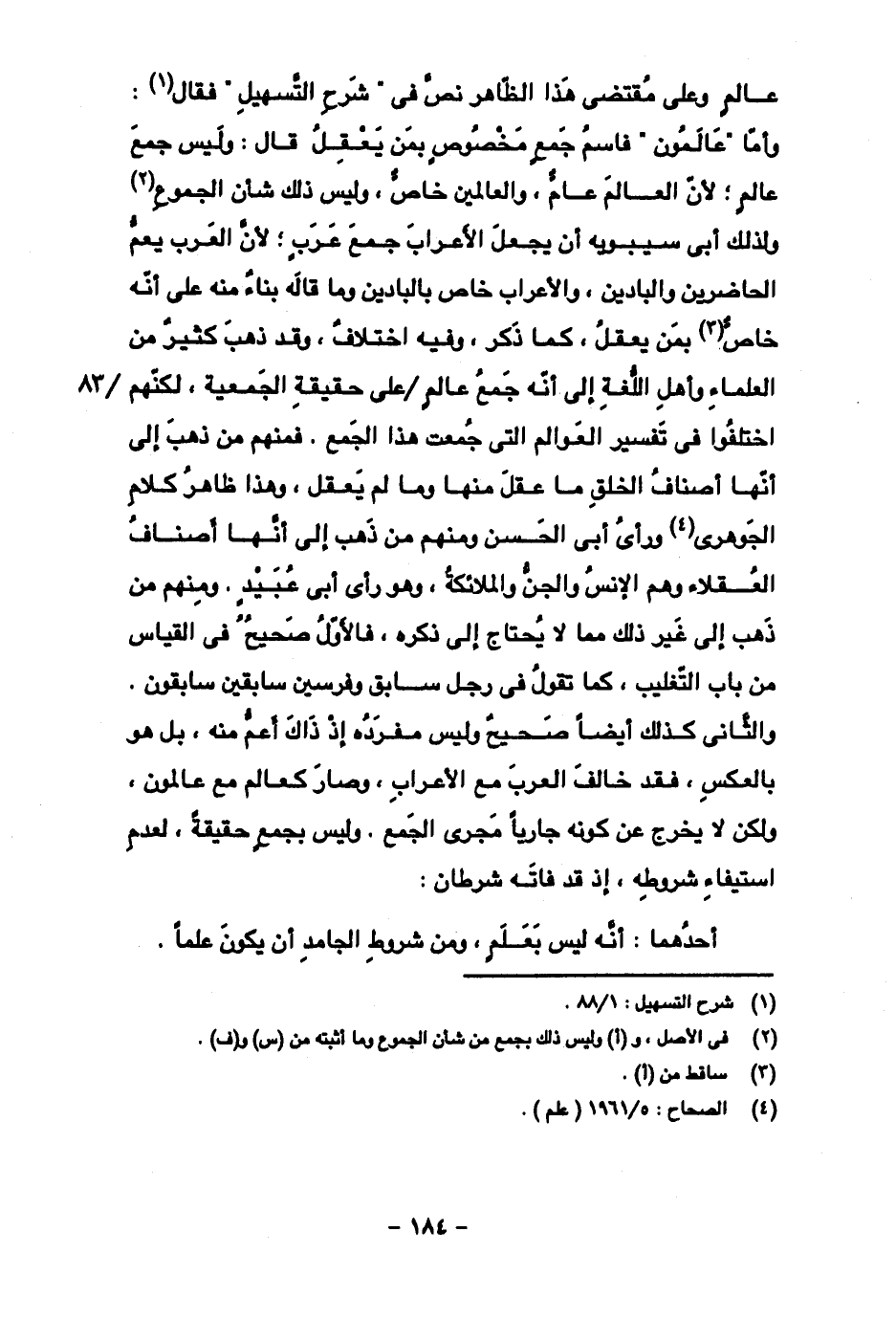 عالم وعلى مقتضى هذا الظاهر نص في "شرح تسهيل" فقال: وأما "عالمون" فاسم جمع مخصوص بمن يعقل قال: وليس جمع عالم؛ لأن العالم عالم، والعالمين خاص، وليس ذلك شأن الجموع ولذلك أبى سيبويه أن يجعل الأعراب جمع عَرَب؛ لأن العرب يعم الحاضرين والبادين، والأعراب خاص بالبادين وما قاله بناء منه على أنه خاص بمن يعقل، كما ذكر، وفيه اختلاف، وقد ذهب كثير من العلماء وأهل اللغة إلى أنه جمع عالم على حقيقة الجمعية، لكنهم اختلفوا في تفسير العوالم التي جمعت هذا الجمع، فمنهم من ذهب إلى أنها أصناف الخلق ما عقل منها ما لم يعقل، وهذا ظاهر كلام الجوهري ورأى أبي الحسن ومنهم من ذهب إلى أنها أصناف العقلاء وهم الإنس والجن والملائكة، وهو رأي أبي عبيد، ومنهم من ذهب غلى غير ذلك مما لا يحتاج إلى ذكره، فالأول صحيح في القياس من باب التغليب، كما تقول في رجل سابق وفرسين سابقين سابقون. والثاني كذلك أيضا صحيح وليس مفردة إذ ذاك أعم منه، بل هو بالعكس، فقد خالف العرب مع الإعراب، وصار كعالم مع عالمون، ولكن لا يخرج عن كونه جاريا مجرى الجمع وليس بجمع حقيقة، لعدم استيفاء شروطه، إذ قد فاته شرطان: