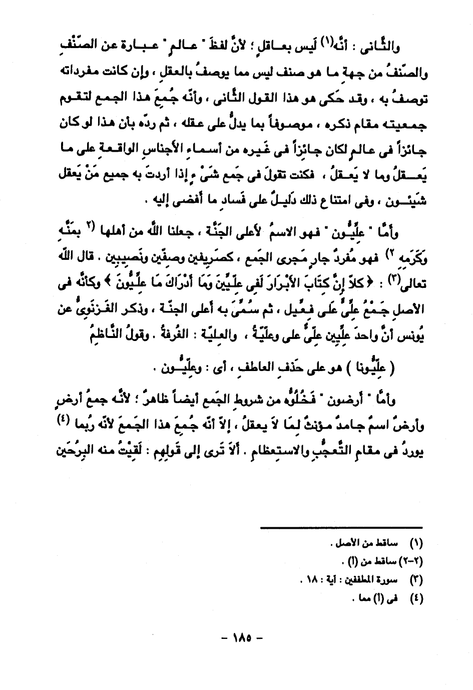 والثاني: أنه ليس بعاقل؛ لأن لفظ "عالم" عبارة عن الصنف والصنف من جهة ما هو صنف ليس مما يوصف بالعقل، وإن كانت مفرداته توصف به، وقد حكى هو هذا القول الثاني، وأنه جمع هذا الجمع لتقويم جمعيته مقام ذكره، موصوفا بما يدل على عقله، ثم رده بأن هذا لو كان جائزا في عالم لكان جائزا في غيره من أسماء الأجناس الواقعة على ما يعقل وما لا يعقل، فكنت تقول في جمع شيء إذا أردت به جميع من يعقل شيئون، وفي امتناع ذلك دليل على فساد ما أفضى إليه.