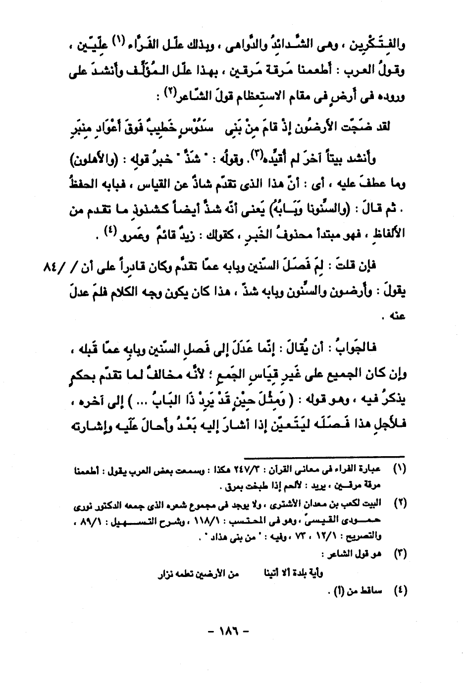 والفتكرين، وهي الشدائد والدواهي، وبذلك علل الفراء عليّين، وقول العرب: أطعمنا مرقة مرقين؛ بهذا علل المؤلف وأنشد على وروده في أرض في مقام الاستعظام قول الشاعر: