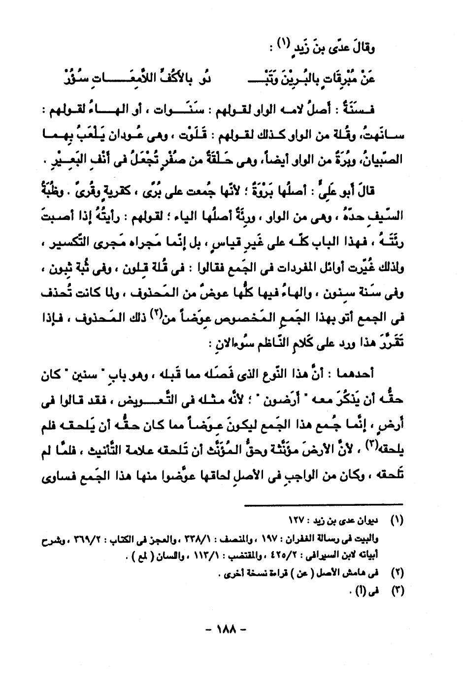 قال أبو علي: أصلها بروة؛ لأنها جمعت على بُرًى، كقرية وقُرًى. وظبة السيف حده، وهي من الواو، ورئة أصلها الياء؛ لقولهم: رأيته إذا أصبت رئتهن فهذا الباب كله على غير قياس، بل إنما مجراه مجرى التكسير، ولذلك غيرت أوائل المفردات في الجمع فقالوا: في قلة قلون، وفي ثبة ثبون، وفي سنة سنون، والهاء فيها كلها عوض من المحذوف، ولما كانت تحذف في الجمع أتو بهذا الجمع المخصوص عوضا من ذلك المحذوف، فإذا تقرر هذا ورد على كلام الناظم سؤالان: