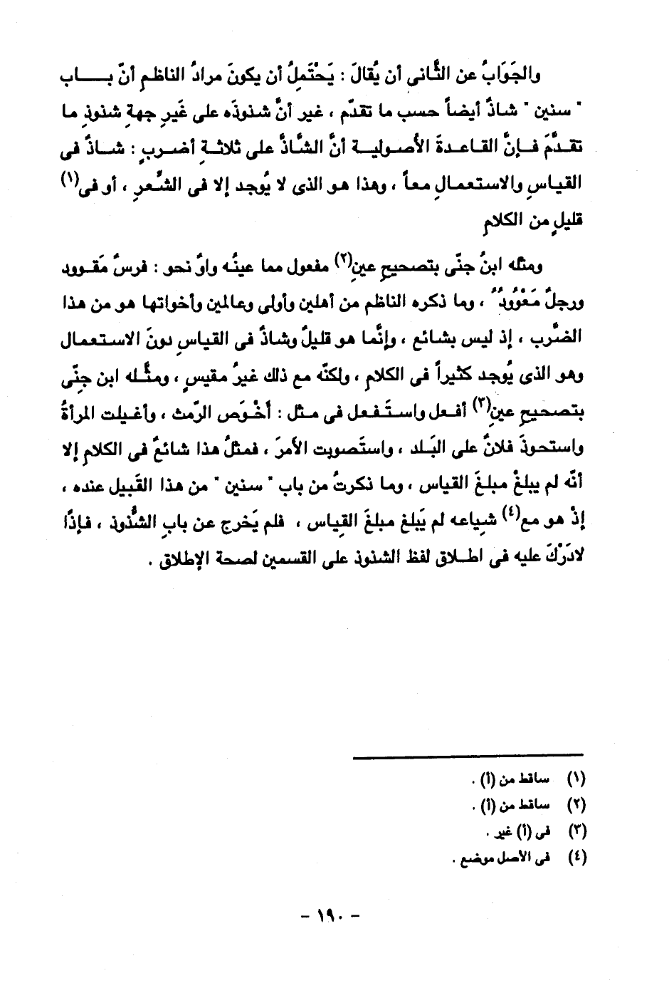 والجواب عن الثاني أن يقال: يحتمل أن يكون مراد الناظم أن باب "سنين" شاذ أيضا حسب ما تقدم، غير أن شذوذه على غير جهة شذوذ ما تقدم فإن القاعدة الأصولية أن الشاذ على ثلاثة أضرب: شاذ في القياس والاستعمال معا، وذا هو الذي لا يوجد إلا في الشعر، أو في قليل من الكلام.