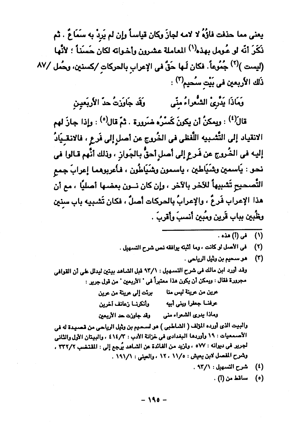 يعني مما حذفت فاؤه لا لامه لجاز وكان قياسا وإن لم يرد به سماع، ثم ذكر أنه لو عومل بهذه المعاملة عشرون وأخوته لكان حسنا؛ لأنها (ليست) جموعا' فكان لها حق في الإعراب بالحركات كسنين، وحمل ذلك الأربعين في بيت سحيم:
