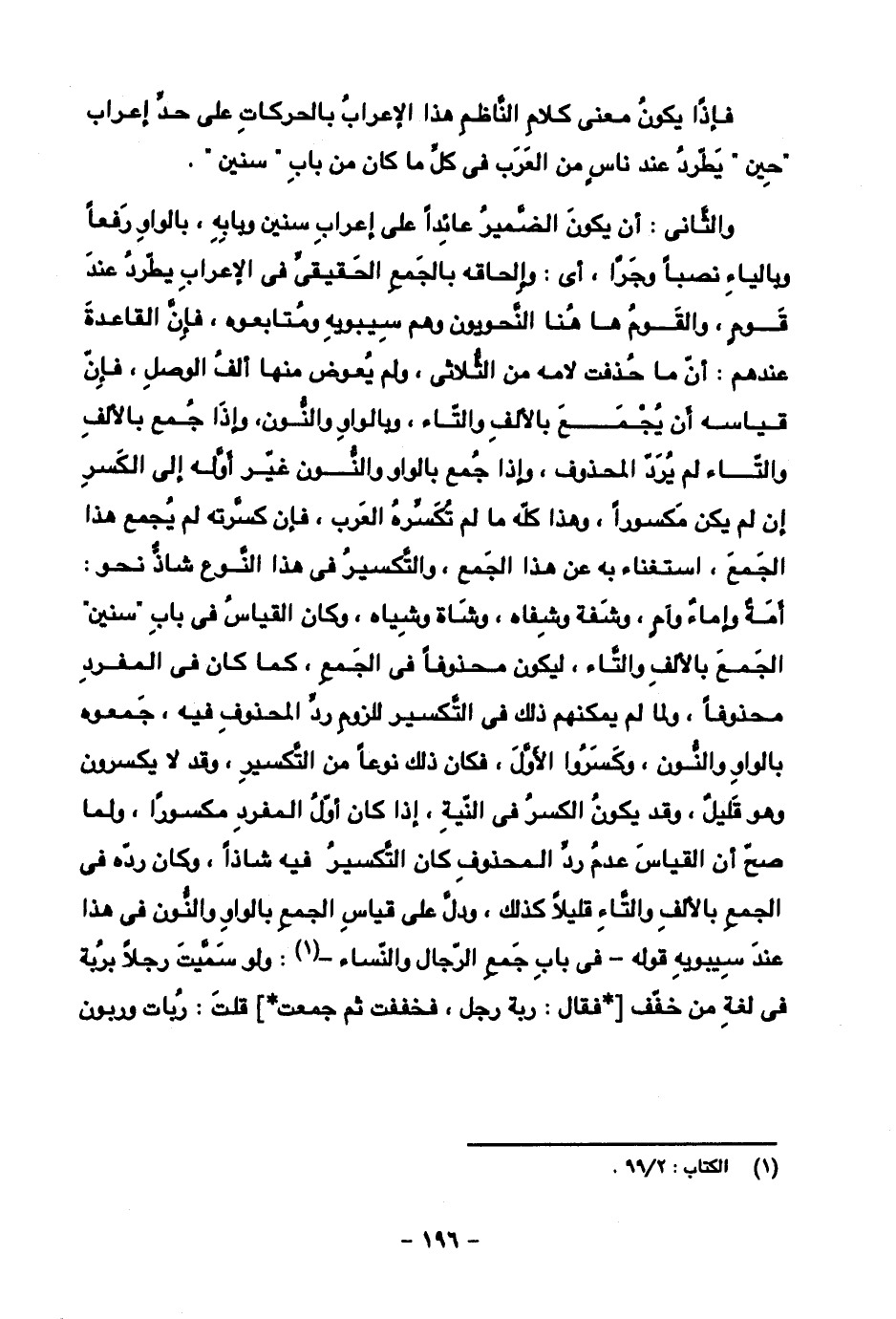 والثاني: أن يكون الضمير عائدا على إعراب سنين وبابه، بالواو رفعا وبالياء نصبا وجرا، أي: وإلحاقه بالجمع الحقيقي في الإعراب يطرد عند قوم، والقوم هاهنا النحويون وهو سيبويه ومتابعوه، فإن القاعدة عندهم: أن ما حذفت لامه من الثلاثي، ولم يعوض منها ألف الوصل، فإن قياسه أن يجمع بالألف والتاء، وبالواو والنون، وإذا جمع بالألف والتاء لم يرد المحذوف، وإذا جمع بالواو والنون غير أوله إلى الكسر إن لم يكن مكسورا، وهذا كله ما لم تكسره العرب، فإن كسرته لم يجمع هذا الجمع، استغناء به عن هذا الجمع، والتكسير في هذا النوع شاذ نحو: أمه وإماء وآمٍ، وشفه وشفاه، وشاة وشياه، وكان القياس في باب "سنين" الجمع بالألف والتاء، ليكون محذوفا في الجمع، كما كان في المفرد محذوفا، ولما لم يمكنهم ذلك في التكسير للزوم رد المحذوف فيه، جمعوه بالواو والنون، وكسروا الأول، فكان ذلك نوعا من التكسير للزوم رد المحذوف فيه، جمعوه بالواو والنون، وكسروا الأول، فكان ذلك نوعا من التكسير، وقد لا يكسرون وهو قليل، وقد يكون الكسر في النية، إذا كان أول المفرد مكسورا، ولما صح القياس عدم رد المحذوف كان التكسير فيه شاذا، وكان رده في الجمع بالألف والتاء قليلا كذلك، ودل على قياس الجمع بالواو والنون في هذا عند سيبويه قوله -في باب جمع الرجال والنساء-: ولو سميت رجلا بربة في لغة من خفف والتكسير في هذا النوع] *فقال: ربة رجل، فخففت ثم جمعت* [قلت: ربات وربون