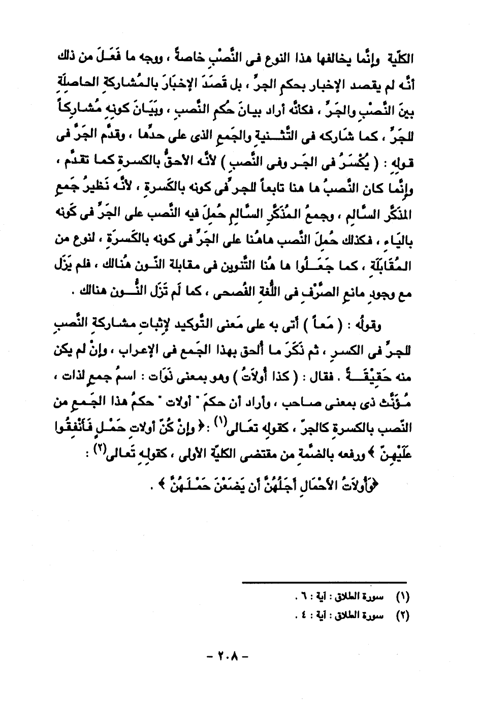 وقوله: (معا) أتى به على معنى التوكيد لإثبات مشاركة النصب للجر في الكسر، ثم ذكر ما ألحق بهذا الجمع في الإعراب، وإن لم يكن منه حقيقة، فقال: (كذا أولات) وهو بمعنى ذوات: اسم جمع لذات، مؤنث بمعنى صاحب، وأراد أن حكم "أولات" حكم هذا الجمع من النصب بالكسرة كالجر، كقوله تعالى: ((وإن كن أولات حمل فأنفقوا عليهن)) ورفعه بالضمة من مقتضى الكلية الأولى، كقوله تعالى: ((وأولات الأحمال أجلهن أن يضعن حملهن)).