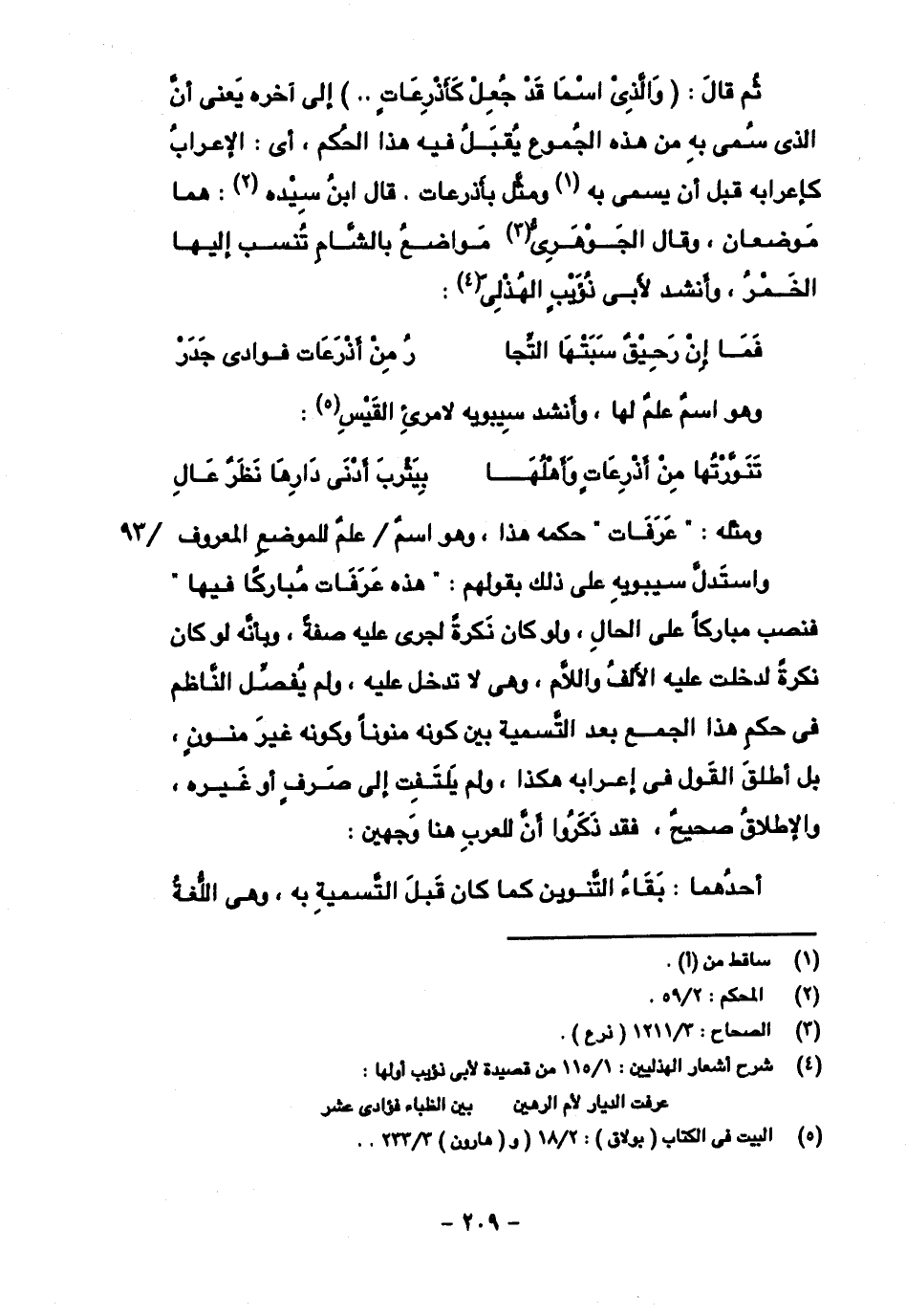 ثم قال: (والذي اسما قد جُعل كأذرِعاتٍ .. ) إلى آخره يعني أن الذي سمي به من الجُموع يقبل فيه هذا الحكم، أي: الإعراب كإعرابه قبل أن يسمى به ومثَّل بأذرعات. قال ابن سيده: هما موضعان، وقال الجوهري مواضع بالشام تنسب إليها الخمر، وأنشد لأبي ذؤيب الهذلي: