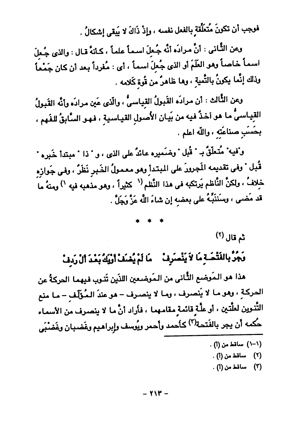 هذا هو الموضع الثاني من الموضعين اللذين تنوب فيهما الحركة عن الحركة، وهو ما لا ينصرف، وما لا ينصرف - هو عند المؤلف - ما منع التنوين لعلتين، أو علّة قائمة مقامهما، فأراد أن ما لا ينصرف من الأسماء حُكمه أن يجر بالفتحة كأَحمد وأحمر ويوسف وإبراهيم وغضبان وغضبى
