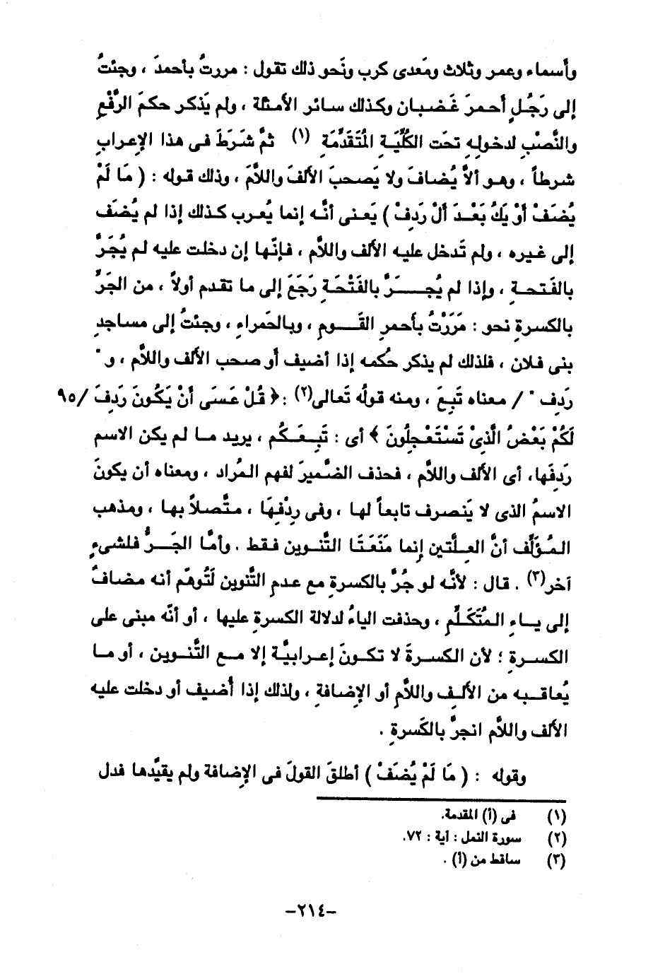 وأسماء وعمر وثلاث ومعدى كرب ونحو ذلك تقول: مررت بأحمد، وجئت إلى رجل أحمر غضبان وكذلك سائر الأمثلة، ولم يذكر حكم الرفع والنصب لدخوله تحت الكلية سائر الأمثلة، ولم يذكر حكم الرفع والنصب لدخوله تحت الكلية المتقدمة ثم شرط في هذا الإعراب شرطا، وهو ألا يضاف ولا يصحب الألف واللام، وذلك قوله: (ما لم يضف أو يك بعد أل ردف) بمعنى أنه إنما يعرب كذلك إذا لم يضف إلى غيره، ولم تدخل عليه الأللف واللام، فإنها إن دخلت عليه لم يجر بالفتحة، وإذا لم يجر بالفتحة رجع إلى ما تقدم أولا، من الجر بالكسرة نحو: مررت بأحمر القوم، وبالحمراء، وجئت إلى مساجد بني فلان، فذلك لم يذكر حكمه إذا أضيف أو صحب الألف واللام، و "ردف" معناه تبع، ومنه قوله تعالى: ((قل عسى أن يكون ردف لكم بعض الذي تستعجلون)) أي: تبعكم، يردي ما لم يكن الاسم ردفها، أي الألف واللام، فحذف الضمير لفهم المراد، ومعناه أن يكون الاسم الذي لا ينصرف تابعا لها، وفي ردفها، متصلا بها، ومذهب المؤلف أن العلتين إنما منعتا التنوين فقط، وأما الجر فلشيء آخر، قال: لأنه لو جر بالكسرة مع عدم التنوين لتوهم أنه مضاف إلى ياء المتكلم، وحذفت الياء لدلالة الكسرة عليها، أو أنه مبني على الكسرة؛ لأن الكسرة لا تكون إعرابية إلا مع التنوين، أو ما يعاقبه من الألف واللام أو الإضافة، ولذلك إذا أضيف أو دخلت عليه الألف واللام انجر بالكسرة.