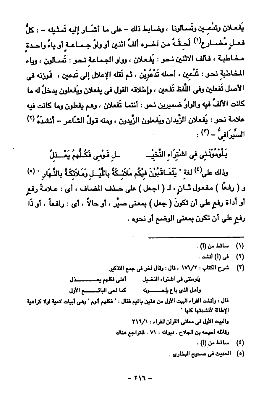 يفعلان وتدعين وتسألونا، وضابط ذلك -على ما أشار إليه تمثيله-: كل فعل مضارع لحقه من آخره ألف اثنين أو واو جماعة أو ياء واحدة مخاطبة، فألف اثنين نحو: يفعلان، وواو الجماعة نحو: تسألون، وياء المخاطبة نحو: تدعين، أصله تدعوين، ثم نقله الإعلال إلى تدعين، فوزنه في الأصل تفعلين وفي اللفظ تفعين، وإطلاقه القول في يفعلان ويفعلون يدخل له ما كانت الألف فيه والواو ضميرين نحو: أنتما تفعلان، وهم يفعلون وما كانت فيه علامة نحو: يعلان الزيدان ويفعلون الزيدون، ومنه قول الشاعر -أنشده السيرافي-: