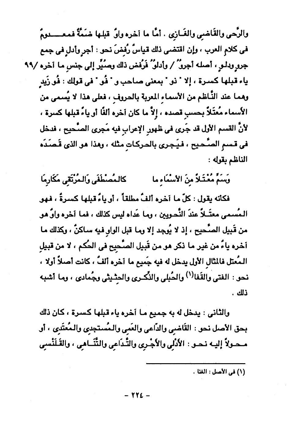 فكأنه يقول: كل ما آخره ألف مطلقا، أو ياء قبلها كسرة، فهو المسمى معتلا عند النحويين، وما عداه ليس كذلك، فما آخره واو هو من قبيل الصحيح، إذ لا يوجد إلا وما قبل الواو فيه ساكن، وكذلك ما آخره ياء من غير ما ذكر هو من قبيل الصحيح في الحكم، لا من قبيل المعتل فالمثال الأول يدخل له فيه جميع ما آخره ألف، كانت أصلا أو لا، نحو: الفتى والقفا والحبلى والذكرى والحثيثى وجمادى، وما أشبه ذلك.