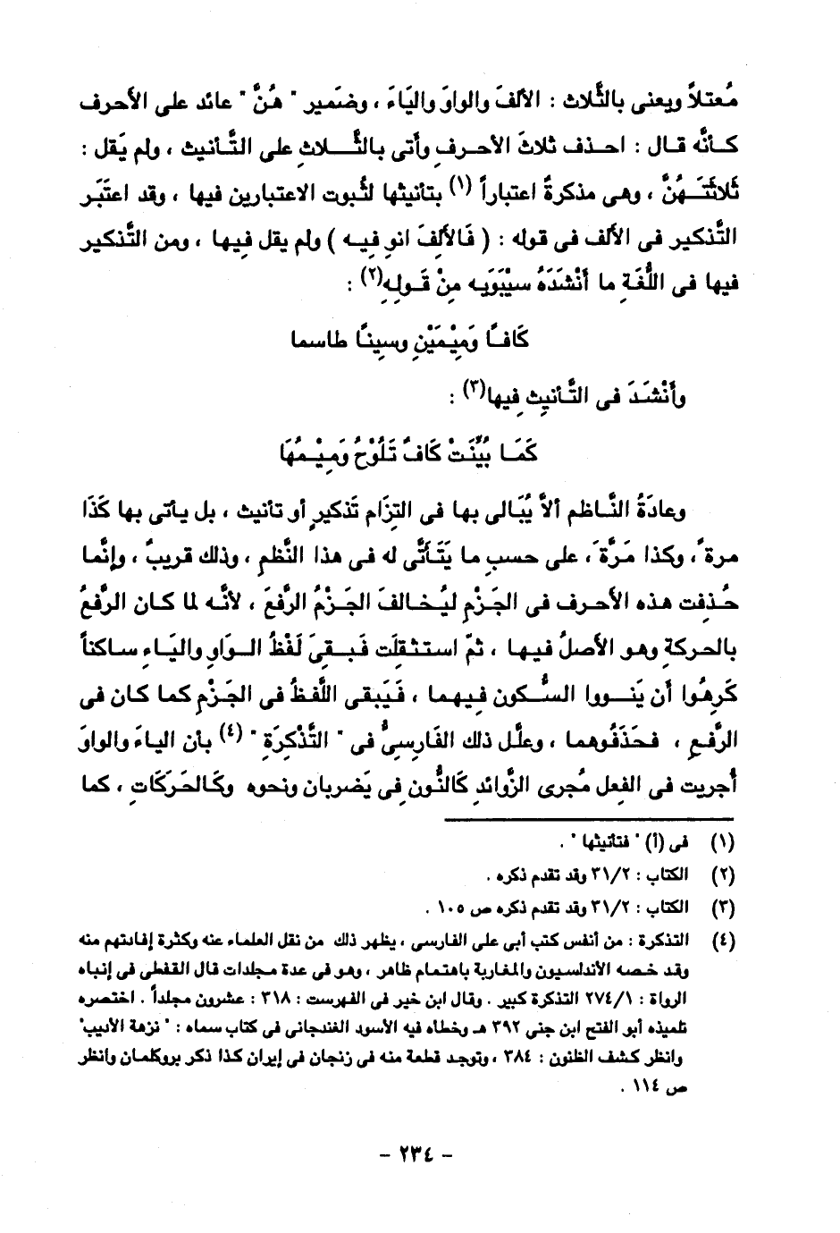 وعادة الناظم ألا يبالي بها في التزام تذكير أو تأنيث، بل يأتي بها كذا مرة، وكذا مرة، على حسب ما يتأتى له في هذا النظم، وذلك قريب، وإنما حذفت هذه الأحرف في الجزم ليخالف الجزم الرفع، لأنه لما كان الرفع بالحركة وهو الأصل فيها، ثم استثقلت فبقي لفظ الواو والياء ساكنا كرهوا أن ينووا السكون فيهما، فيبقى اللفظ في الجزم كما كان في رفع، فحذفوهما، وعلل ذلك الفارسي في "التذكرة" بأن الياء والواو أجريت في الفعل مجرى الزوائد كالنون في يضربان ونحوه وكالحركات، كما