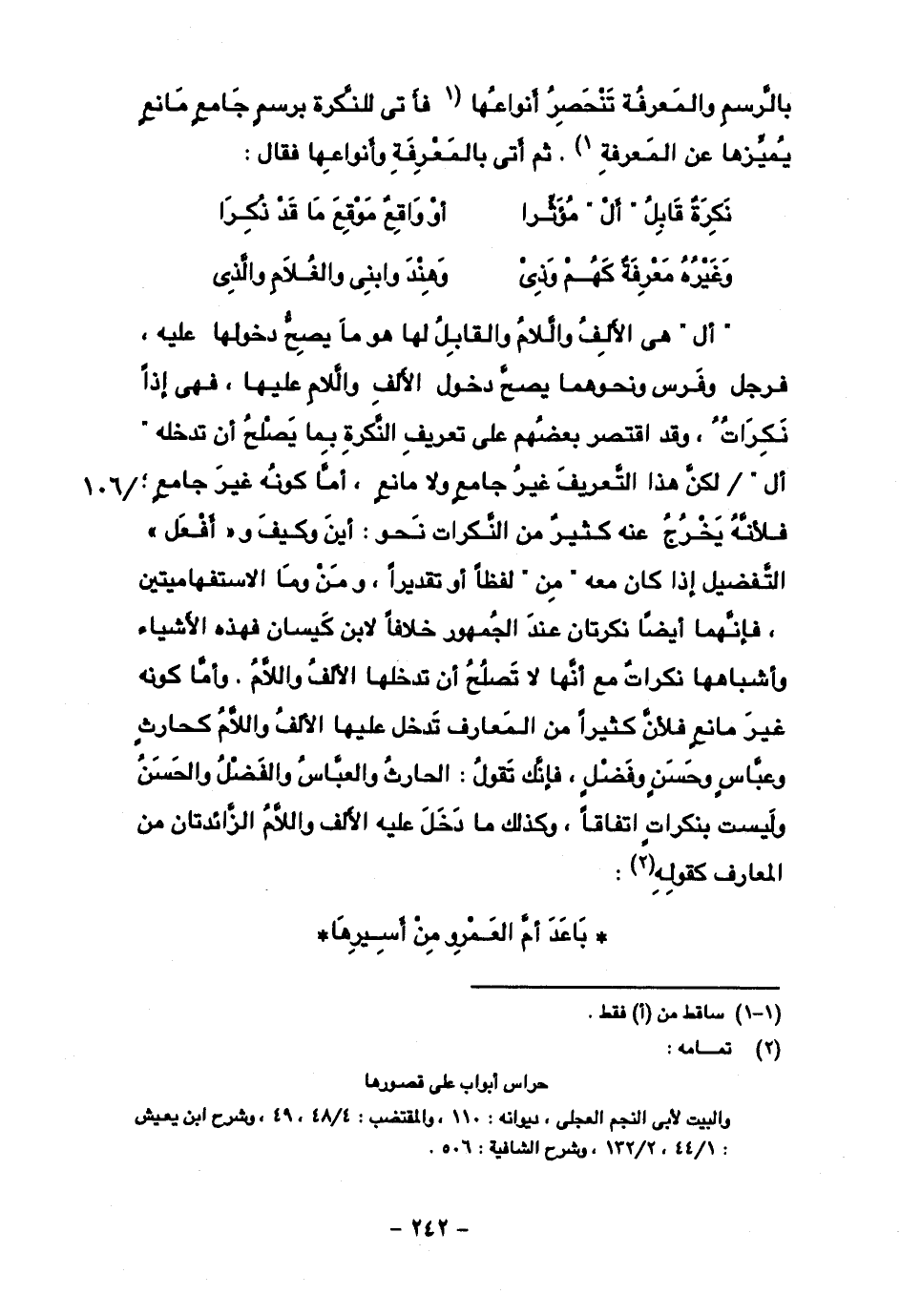 بالرسم والمعرفة تنحصر أنواعها فأتى للنكرة برسم جامع مانع يميزها عن المعرفة. ثم أتى بالمعرفة وأنواعها فقال: