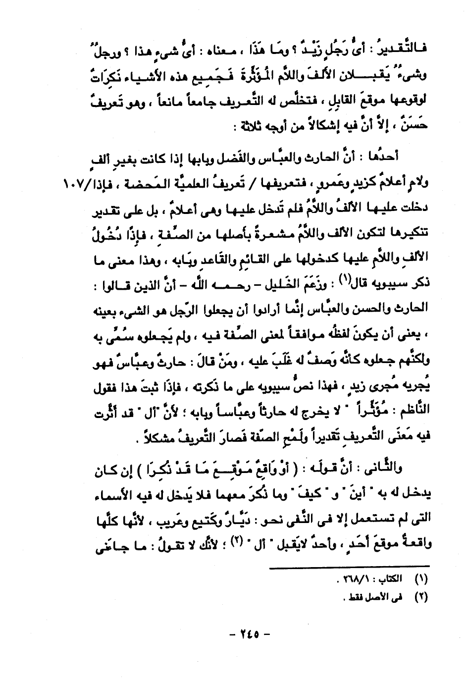 أحدها: أن الحارث والعباس والفضل وبابها إذا كانت بغير ألف ولام أعلام كزيد وعمرو، فتعريفها تعريف العلمية المحضة، فإذا دخلت عليها الألف واللام فلم تدخل عليها وهي أعلام، بل تقدير تنكيرها لتكون الألف واللام مشعرة بأصلها من الصفة، فإذا دخول الألف واللام عليها كدخولها على القائم والقاد وبابه، وهذا معنى ما ذكر سيبويه قال: وزعم الخليل -رحمه الله- أن الذين قالوا: الحارث والحسن والعباس إنما أرادوا أن يجعلوا الرجل هو الشيء بعينه، يعني أن يكون لفظه موافقا لمعنى الصفة فيه، ولم يجعلوه سمي به ولكنهم جعلوه كأنه وصف له غلب عليه، ومن قال: حارث وعباس فهو يجريه مجرى زيد، فهذا انص سيبويه على ما ذكرته، فإذ ثبت هذا فقول الناظم: "مؤثرا" لا يخرج له حارثا وعباسا وبابه؛ لأن "أل" قد أثرت فيه معنى التعريف تقديرا ولمح الصفة فصار التعريف مشكلا.