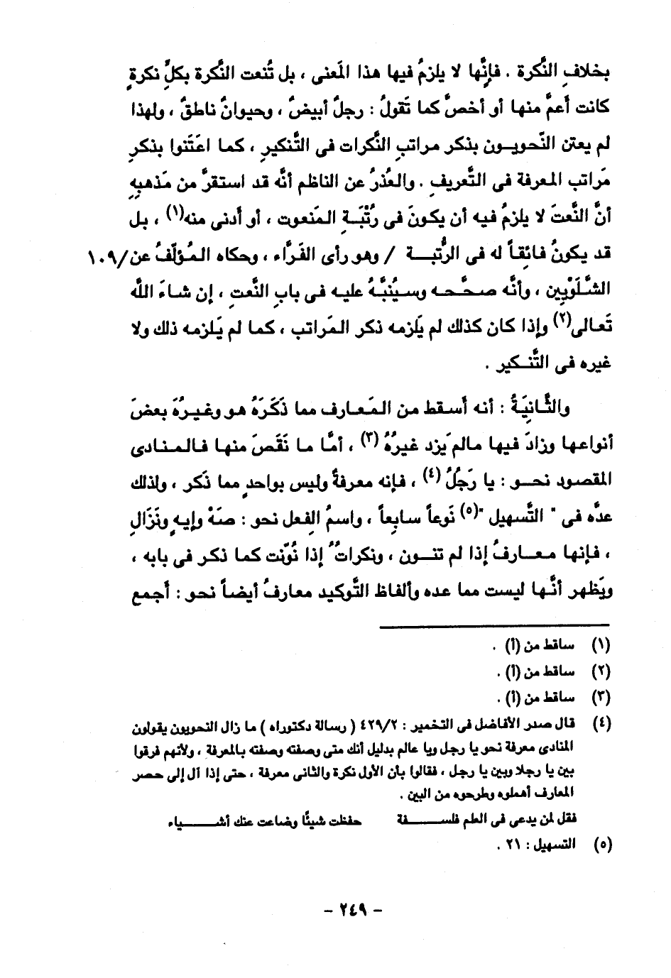 والثانية: أنه أسقط من المعارف مما ذكره هو وغيره بعض أنواعها وزاد فيها ما لم يزد غيره، أما ما نقص منها فالمنادي المقصود نحو: يا رجل، فإنه معرفةٌ وليس بواحدٍ مما ذكر، ولذلك عدّه في "التسهيل" نوعًا سابعًا، واسم الفعل نحو: صه وإيهٍ ونزال، فإنها معارف إذا لم تنون، ونكراتٌ إذا نوّنت كما ذكر في بابه، ويظهر أنها ليست مما عده وألفاظ التوكيد معارفُ أيضًا نحو: أجمع