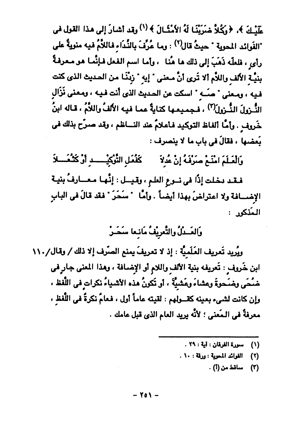ويريد تعريف العملية: إذ لا تعريف يمنع الصرف إلا ذلك وقال ابن خروف: تعريفه بنية الألف واللام أو الإضافة، وهذا المعنى جارٍ في ضُحى وضَحوةَ وعشاءَ وعشيَّة، أو تكون هذه الأشياء نكراتٍ في اللفظ، وإن كانت لشيء بعينه كقولهم: لقيته عامًا أول، فعامٌ نكرةٌ في اللفظ، معرفة في المعنى؛ لأنه يريد العام الذي قبل عامك.