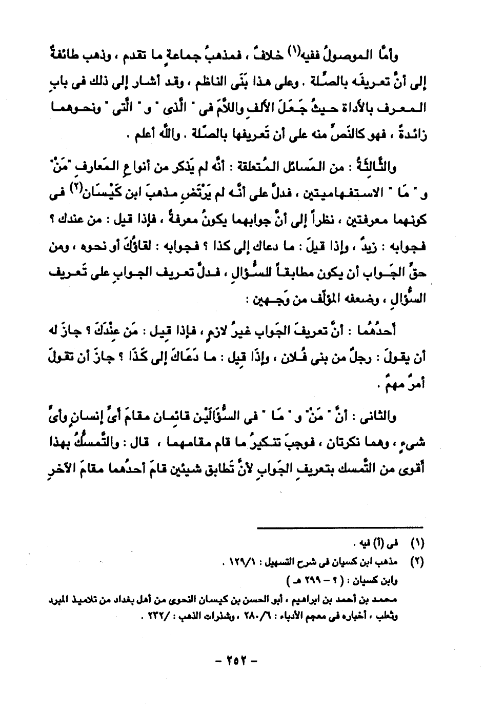 والثالثة: من المسائل المتعلقة: أنه لم يذكر من أنواع المعارف "من" و "ما" الاستفهاميتين، فدل على أنه لم يرتض مذهب ابن كيسان في كونهما معرفتين، نظرًا إلى أن جوابهما يكون معرفةً، فإذا قيل: من عندك؟ فجوابه: زيدٌ، وإذا قيلَ: ما دعاك إلى كذا؟ فجوابه: لقاؤك أو نحوه، ومن حقِّ الجواب أن يكون مطابقًا للسؤال، فدل تعريف الجواب على تعريف السؤال، وضعفه المؤلف من وجهين: