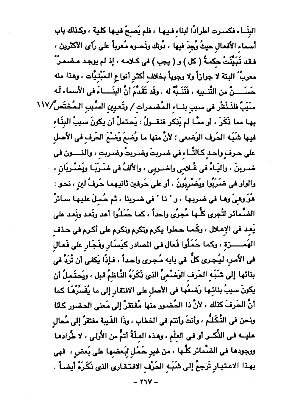 البناء فكسرت اطرادًا لبناء فيها، فلم يصح فيها كلية، وكذلك باب أسماء الأفعال حيث وجد فيها، دونك ونحوه معربًا على رأي الأكثرين، فقد تبينت حكمة (كل) و (يجب) في كلامه، إذ لم يوجد مضمر معرب البتة لا جوازًا ولا وجوبًا بخلاف أكثر أنواع المبينات، وهذا منه حسن من التنبيه، فتنبه له. وقد تقدم أن البناء في الأسماء ل سبب فلننظر في سبب بناء المضمرات/ وتعيين السبب المختص بها مما ذكر، أو مما لم يذكر فنقول: يحتمل أن يكون سبب البناء فيها شبه الحرف الوضعي؛ لأن منها ما وضع وضع الحرف في الأصل على حرف واحد كالتاء في ضربت وضربت وضربت، والنون في ضربن، والياء في غلامي واضربي، والألف في ضربا ويضربان، والواو في ضربوا ويضربون. أو على حرفين ثانيهما حرف لين، نحو: هو وهي وها في ضربها، و "نا" في ضربنا، ثم حمل عليا سائر الضمائر لتجرى كلها مجرى واحدًا، كما حملوا أعد وتعد ونعد على يعد في الإعلال، وكما حملوا يكرم وتكرم ونكرم على أكرم في حذف الهمزة، وكما حملوا فعال في المصادر كيسار وفجار على فعال في الأمر، ليجرى كل في باب مجرى واحدًا، فإذا يكفى أن ترد في بنائها إلى شبه الحرف الوضعي الذي ذكره الناظم قبل، ويحتمل أن يكون سبب بنائها وضعها في الأصل على الافتقار إلى ما يفسرها كما أن الحرف كذلك، لأن ذا الحضور منها مفتقر إلى معنى الحضور كأنا ونحن في التكلم، وأنت وأنتم في الخطاب، وذا الغيبة مفتقر إلى محال علي في لذكر أو في العلم، وهذه العلة أتم من الأولى، لا طرادها ووجودها في الضمائر كلها، من غير حمل لبعضها على بعض، فهي بهذا الاعتبار ترجع إلى شبه الحرف الافتقارى الذي ذكره أيضا.