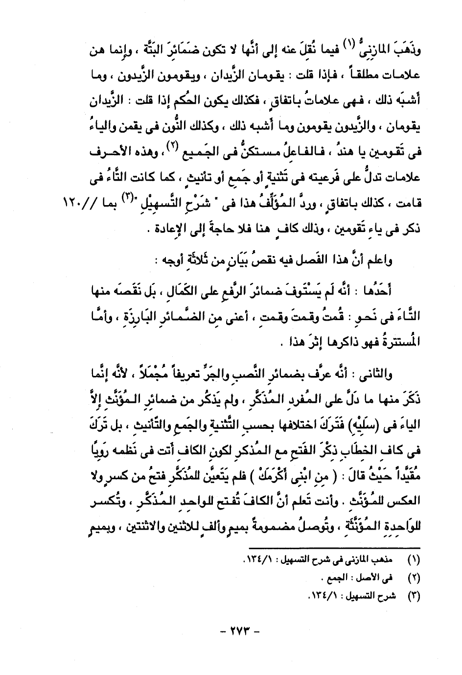 والثاني: أنه عرف بضمائر النصب والجر تعريفا مجملا، لأنه إنما ذكر منها ما دل على المفرد المذكر، ولم يذكر من ضمائر المؤنث إلا الياء في (سليه) فترك اختلافها بحسب التثنية والجمع والتأنيث، بل ترك في كاف الخطاب ذكر الفتح مع المذكر لكون كاف أتت في نظمه رويًا مقيدًا حيث قال: (من ابني أكرمك) فلم يتعين للمذكر فتح من كسر ولا العكس للمؤنث. وأنت تعلم أن الكاف تفتح للواحد المذكر، وتكسر للواحدة المؤنثة، وتوصل مضمومة بميم وألف للاثنين والاثنتين، وبميمٍ