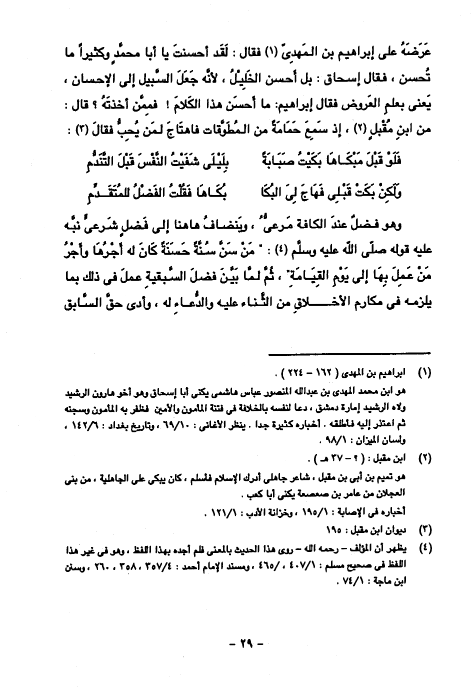 عرضه على إبراهيم بن المهدي فقال: لقد أحسنت يا أبا محمد وكثيرا ما تحسن، فقال إسحاق: بل أحسن الخليل، لأنه جعل السبيل إلى الإحسان، يعني بعلم العروض فقال إبراهيم: ما أحسن هذا الكلام! فممن أخذته؟ قال: من ابن مقبل، إذ سمع حمامة من المطوقات فاهتاج لمن يحب فقال: