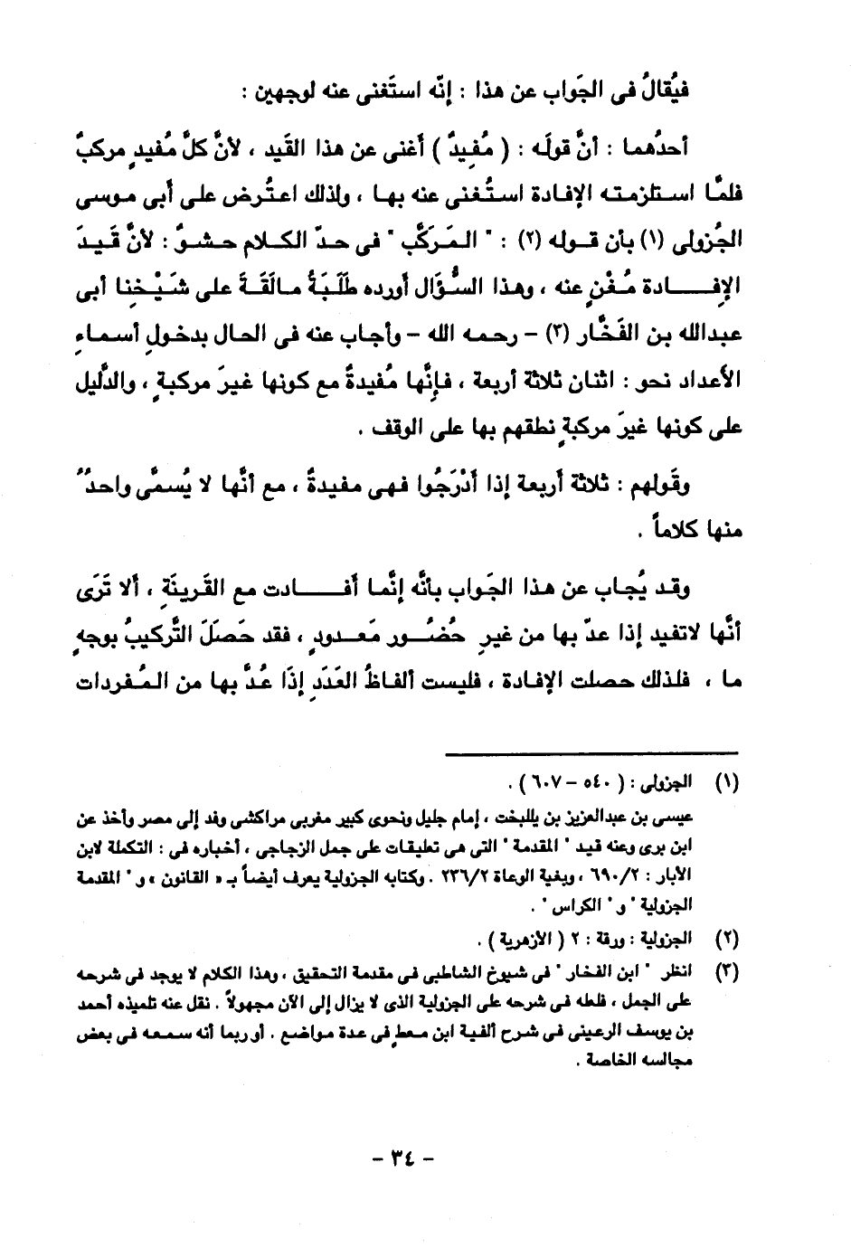 أحدهما: أن قوله: (مفيد) أغنى عن هذا القيد، لأن كل مفيد مركب فلما استلزمته الإفادة استغنى عنه بها، ولذلك اعترض على أبي موسى الجزولي بأن قوله: المركب في حد الكلام حشو: لأن قيد الإفادة مغن عنه، وهذا السؤال أورده طلبة مالقة على شيخنا أبي عبد الله الفخار -رحمه الله- وأجاب عنه في الحال بدخول أسماء الأعداد نحو: اثنان ثلاثة أربعة، فإنها مفيدة مع كونها غير مركبة، والدليل على كونها غير مركبة نطقهم بها على الوقف.