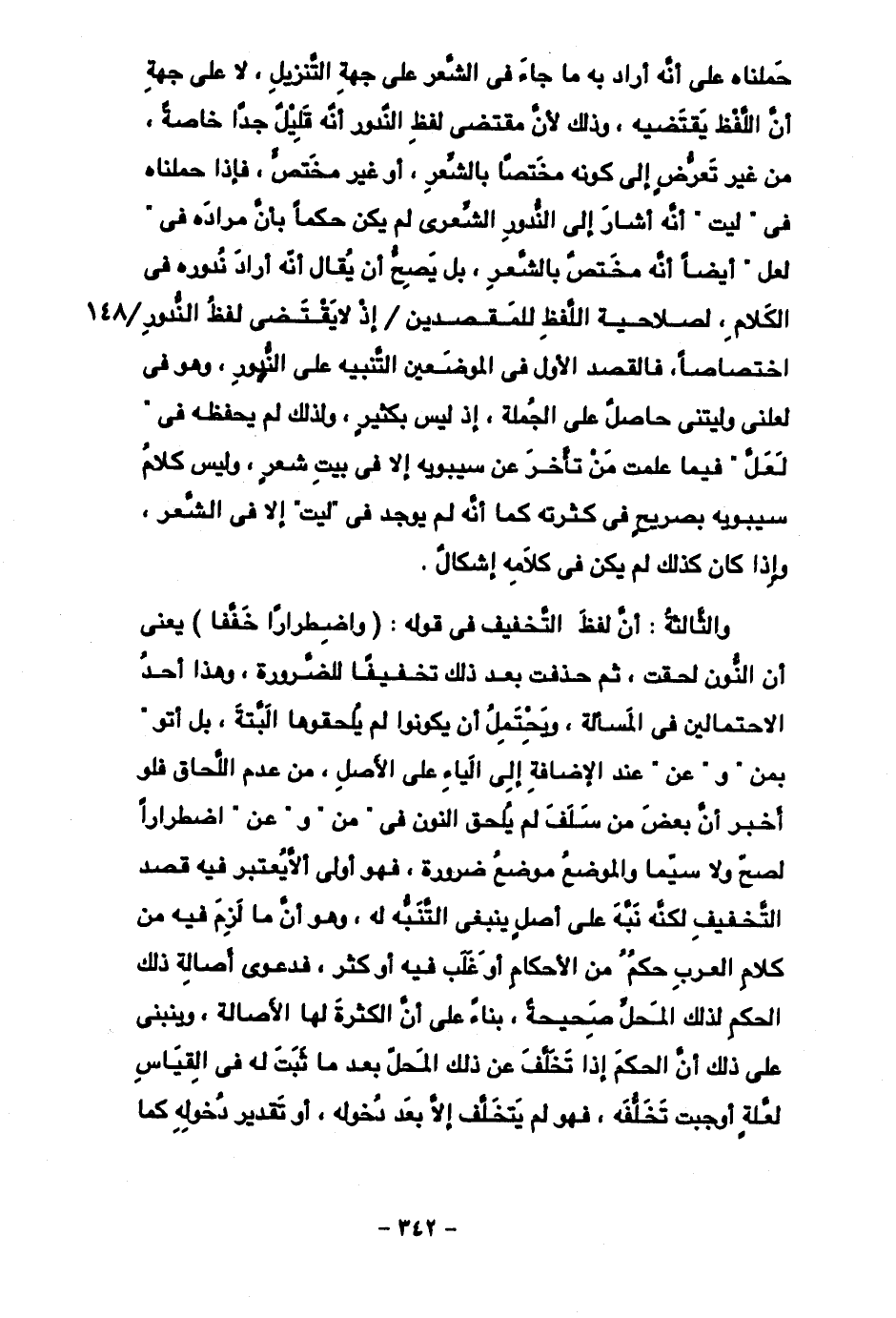 والثالثة: أن لفظ التخفيف في قوله: (واضطرارًا خففا) يعني أن الندوة لحقت، ثم حذفت بعد ذلك تخفيفًا للضرورة، وهذا أحد الاحتمالين في المسألة، ويحتمل أن يكونوا لم يلحقوها البتة، بل أتو "بمن" و"عن" عند الإضافة إلى الياء على الأصل، من عدم اللحاق فلو أخبر أن بعض من سلف لم يلحق النون في "من" و"عن" اضطرارًا لصح ولا سيما والموضع موضع ضرورة، فهو أولى ألا يع تبر فيه قصد التخفيف لكنه نبه على أصل ينبغي التنبه له، وهو أن ما لزم فيه من كلام العرب حكم من الأحكام أو غلب فيه أو أكثر، فدعوى أصالة ذلك الحكم لذلك المحل صحيحة، بناء على أن الكثرة لها الأصالة، وينبني على ذلك أن الحكم إذا تخلف عن ذلك المحل بعد ما ثبت له في القياس لعلةٍ أوجبت تخلفه، فهو لم يتخلف إلا بعد دخوله، أو تقدير دخوله كما