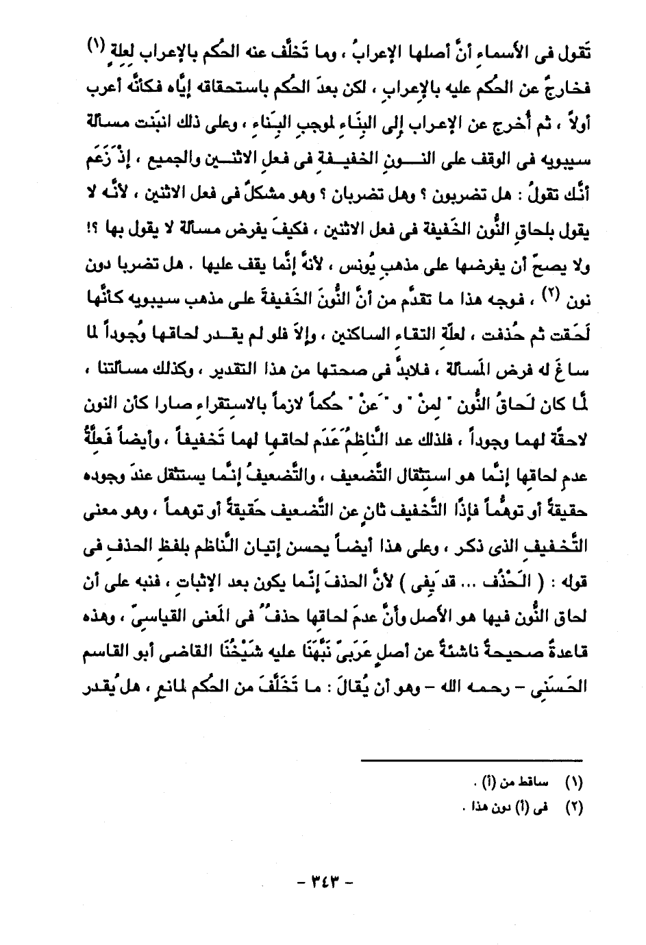 تقول في الأسماء أن أصلها الإعراب، وما تخلف عنه الحكم بالإعراب لعلة فخارج عن الحكم عليه بالإعراب، لكن بعد الحكم باستحقاقه إياه فكأنه أعرب أولا، ثم أخرج عن الإعراب إلى البناء لموجب البناء، وعلى ذلك انبنت مسألة سيبويه في الوقف على النون الخفيفة في فعل الاثنين والجميع، إذ زعم أنك تقول: هل تضربون؟ وهل تضربان؟ وهو مشكل في فعل الاثنين، لأنه لا يقول بلحاق النون الخفيفة في فعل الاثنين، فكيف يفرض مسألة لا يقول بها؟ ! ولا يصح أن يفرضها على مذهب يونس، لأنه إنما يقف عليها. هل تضربا دون نون، فوجه هذا ما تقدم من أن النون الخفيفة على مذهب سيبويه كأنها لحقت ثم حذفت، لعلة التقاء الساكنين، وإلا فلو لم يقدر لحاقها وجودًا لما ساغ له فرض المسألة، فلا بد في صحتها من هذا التقدير، وكذلك مسألتنا لما كان لحاق النون "لمن" و"عن" حكمًا لازمًا بالاستقراء صارا كأن النون لاحقة لهما وجودًا، فلذلك عد الناظم عدم لحاقها لهما تخفيفًا، وأيضا فعلة عدم لحاقها إنما هو استثقال التضعيف، والتضعيف إنما يستثقل عند وجوده حقيقة أو توهمًا فإذا التخفيف ثان عن التضعيف حقيقة أو توهمًا، وهو معنى التخفيف الذي ذكر، وعلى هذا أيضًا يحسن إتيان الناظم بلفظ الحذف في قوله: (الحذف ... قد يفي) لأن الحذف إنما يكون بعد الإثبات، فنبه على أن لحاق النون فيها هو الأصل وأن عدم لحاقها حذف في المعنى القياسي، وهذه قاعدة صحيحة ناشئة عن أصل عربي نبهنا عليه شيخنا القاضي أبو القاسم الحسني- رحمه الله- وهو أن يقال: ما تخلف من الحكم لمانع، هل يقدر