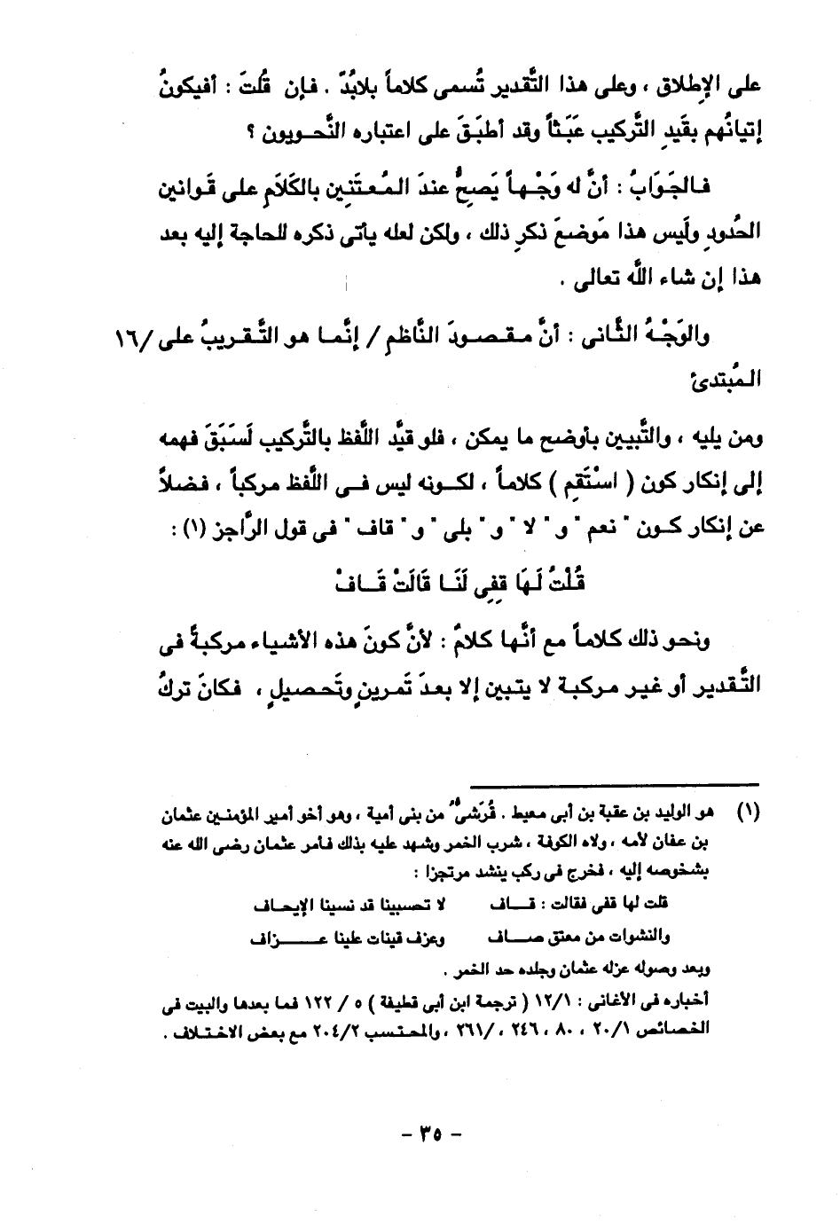 والوجه الثاني: أن مقصود الناظم إنما هو تقريب على المبتدئ ومن يليه، والتبيين بأوضح ما يمكن، فلو قيد اللفظ التركيب لسبق فهمه إلى إنكار كون (استقم) كلاما، لكونه ليس في اللفظ مركبا، فضلا عن إنكار كون "نعم" و "لا" و "بلى" و "قاف" في قول الراجز: