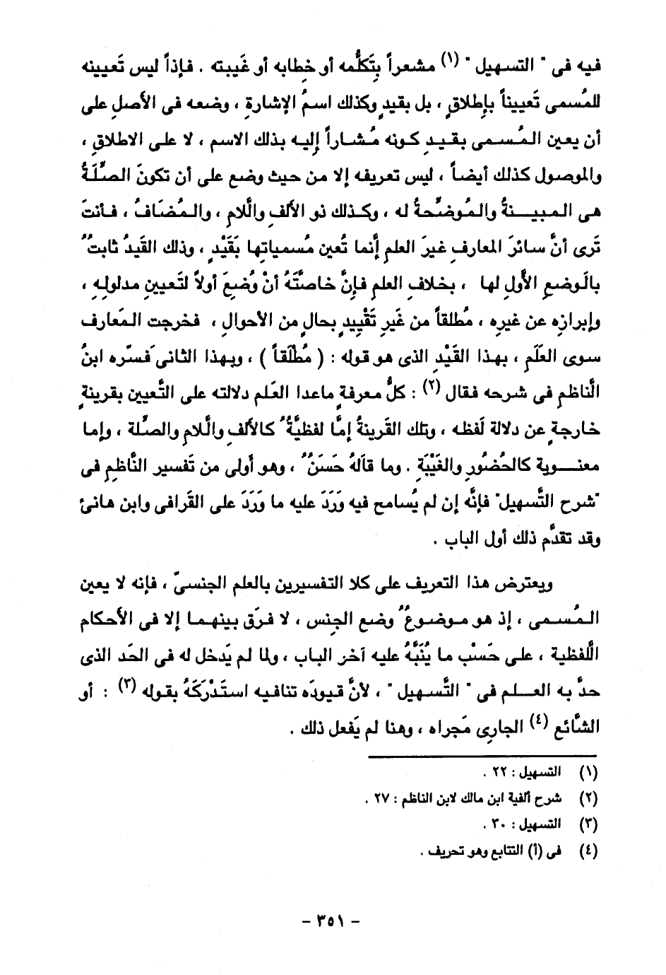 فيه في "التسهيل" مشعرًا بتكلمه أو خطابه أو غيبته. فإذا ليس تعيينه للمسمى تعيينًا بإطلاق، بل بقيد وكذلك اسم الإشارة، وضعه في الأصل على أن يعين المسمى بقيد كونه مشارًا إليه بذلك الاسم، لا على الإطلاق، والموصول كذلك أيضا، ليس تعريفه إلا من حيث وضع على أن تكون الصلة هي المبينة والموضحة له، وكذلك ذو الألف واللام، والمضاف، فأنت ترى أن سائر المعارف غير العلم إنما تعين مسمياتها بقيد، وذلك القيد الثابت بالوضع الأول لها، بخلاف العلم فإن خاصته أن وضع أولا لتعيين مدلوله، وإبرازه عن غيره، مطلقا من غير تقييد بحال من الأحوال، فخرجت المعارف سوى العلم، بهذا القيد الذي هو قوله: (مطلقا)، وبهذا الثاني فسره ابن الناظم في شرحه فقال: كل معرفة ما عدا العلم دلالته على التعيين بقرينة خارجة عن دلالة لفظه، وتلك القرينة إما لفظية كالألف واللام والصلة، وإما معنوية كالحضور والغيبة. وما قاله حسن، وهو أولى من تفسير الناظم في "شرح التسهيل" فإنه إن لم يسامح فيه ورد عليه ما ورد على القرافي وابن هانئ وقد تقدم ذلك أول الباب.