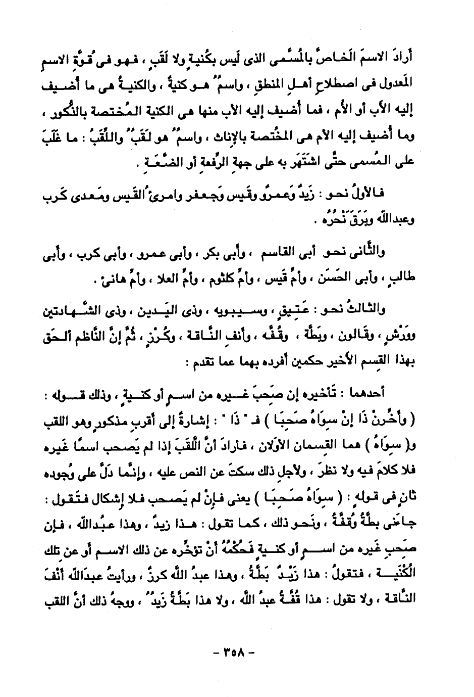والثالث نحو: عتيق، وسيبويه، وذي اليدين، وذي الشهادتين، وورش، وقالون، وبطة، وقفه، وأنف الناقة، وكرز، ثم إن الناظم ألحق بهذا القسم الأخير حكمين أفرده بهما عما تقدم: