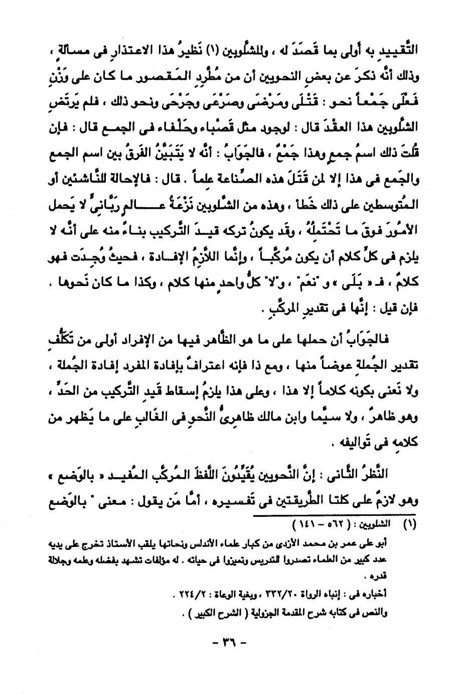 التقييد به أولى بما قصد له، وللشلوبين نظير هذا الاعتذار في مسألة، وذلك أنه ذكر عن بعض النحويين أن من مطرد المقصور ما كان على وزن فعلى جمعا نحو: قتلى ومرضى وجرحى ونحو ذلك، فلم يرتض الشلوبين هذا العقد قال: لوجود مثل قصباء وحلفاء في الجمع قال: فإن قلت ذلك اسم جمع وهذا جمع، فالجواب: أنه لا يتبين الفرق بين اسم الجمع والجمع في هذا إلا لمن قتل هذه الصناعة علما. قال: فالإحالة للناشئين أو المتوسطين على ذلك الخطأ، وهذه من الشلوبين نزعة عالم رباني لا يحمل الأمور فوق ما تحتمله، وقد يكون تركه قيد التركيب بناء منه على أنه لا يلزم في كل كلام أن يكون مركبا، وإنما اللازم الإفادة، فحيث وجدت فهو كلام، فـ "بلى" و "نعم" و "لا" كل واحدة منها كلام، وكذا ما كان نحوها. فإن قيل: إنها في تقدير المركب.