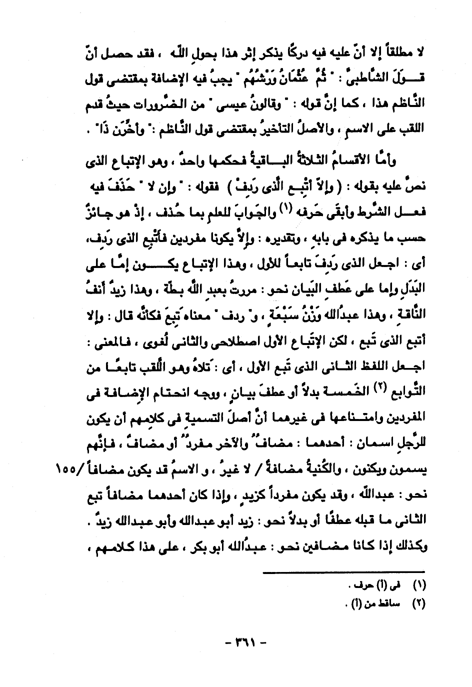 لا مطلقا إلا أن عليه فيه دركا يذكر إثر ها بحول الله، فقد حصل أن قول الشاطبي: "ثم عثمان ورشهم" يجب فيه الإضافة بمقتضى قول الناظم هذا، كما إن قوله: "وقالون عيسى" من الضرورات حيث قدم اللقب على الاسم، والأصل التأخير بمقتضى وقول الناظم: "وأخرن ذا".