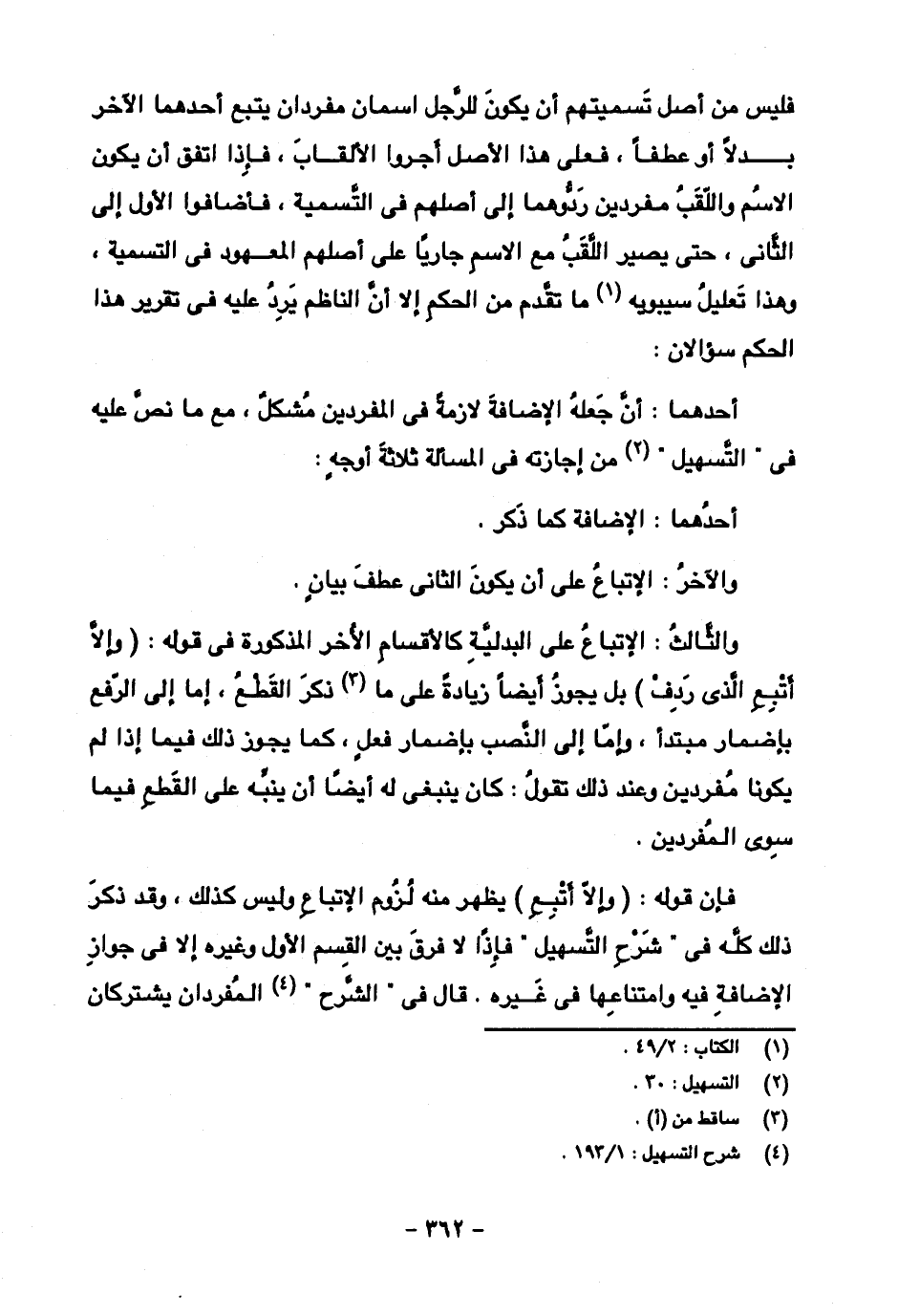 فليس من أصل تسميتهم أن يكون للرجل اسمان مفردان يتبع أحدهما الآخر بدلا أو عطفا، فعلى هذا الأصل أجروا الألقاب، فإذا اتفق أن يكون الاسم واللقب مفردين ردوهما إلى أصلهم في التسمية، فأضافوا الأول إلى الثاني، حتى يصير اللقب مع الاسم جاريا على أصلهم المعهود في التسمية، وهذا تعليل سيبويه ما تقدم من الحكم إلا أن الناظم يرد عليه في تقرير هذا الحكم سؤالان: