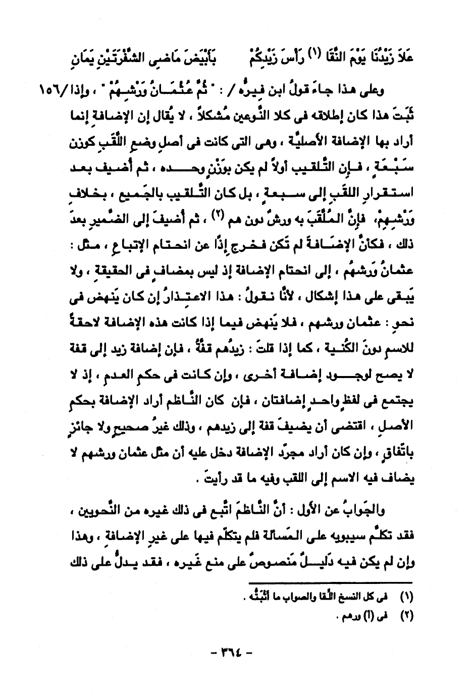 وعلى هذا جاء قول ابن فيره/: "ثم عثمان ورشهم"، وإذا ثبت هذا كان إطلاقه في كلا النوعين مشكلا، لا يقال إن الإضافة إنما أراد بها الإضافة الأصلية، وهي التي كانت في أصل وضع اللقب كوزن سبعة، فإن التلقيب أولا لم يكن بوزن وحده، ثم أضيف بعد استقرار اللقب إلى سبعة، بل كان التلقيب بالجميع، بخلاف ورشهم، فإن الملقب به ورش دون هم، ثم أضيف إلى الضمير بعد ذلك، فكأن الإضافة لم تكن فخرج إذا عن انحتام الإتباع، مثل: عثمان ورشهم، إلى انحتام الإضافة إذ ليس بمضاف في الحقيقة، ولا يبقى على هذا إشكال، لأنا نقول: هذا الاعتذار إن كان ينهض في نحو: عثمان ورشهم، فلا ينهض فيما إذا كانت هذه الإضافة لاحقة للاسم دون الكنية، كما إذا قلت: زيدهم قفة، فإن إضافة زيد إلى قفة لا يصح لوجود إضافة أخرى، وإن كانت في حكم العدم، إذ لا يجتمع في لفظ واحد إضافتان، فإن كان الناظم أراد الإضافة بحكم الأصل، اقتضى أن يضيف قفة إلى زيدهم، وذلك غير صحيح ولا جائز باتفاق، وإن كان أراد مجرد الإضافة دخل عليه أن مثل عثمان ورشهم لا يضاف فيه الاسم إلى اللقب وفيه ما قد رأيت.