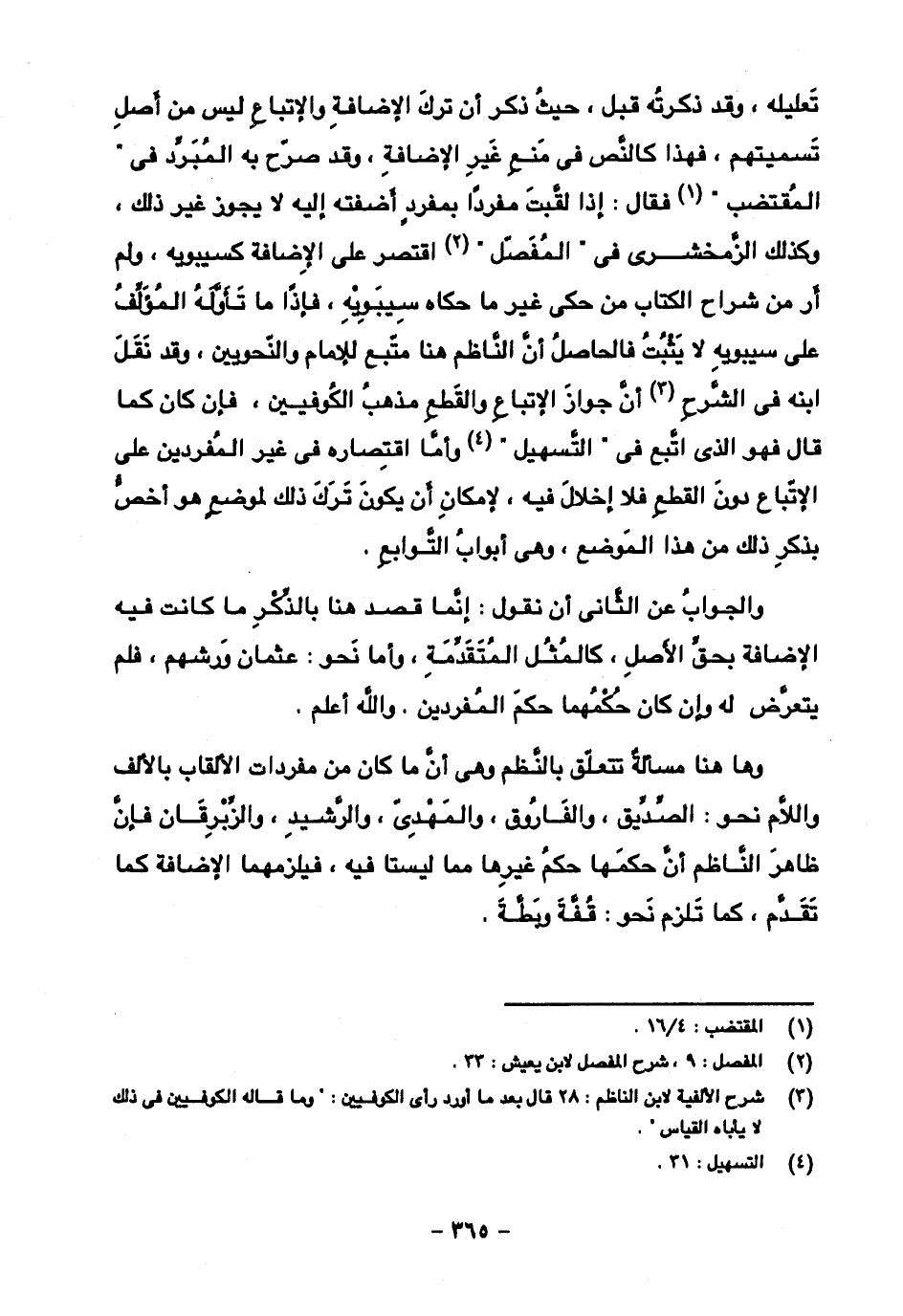 تعليله، وقد ذكرته قبل، حيث ذكر أن ترك الإضافة والإتباع ليس من أصل تسميتهم، فهذا كالنص في منع غير الإضافة، وقد صرح به المبرد في "المقتضب" فقال: إذا لقبت مفردا بمفرد أضفته إليه لا يجوز غير ذلك، وكذلك الزمخشري في "المفصل" اقتصر على الإضافة كسيبويه، ولم أر من شراح الكتاب من حكى غير ما حكاه سيبويه، فإذا ما تأوله المؤلف على سيبويه لا يثبت فالحاصل أن الناظم هنا متبع للإمام والنحويين، وقد نقل ابنه في الشرح أن جواز الإتباع والقطع مذهب الكوفيين، فإن كان كما قال فهو الذي اتبع في "التسهيل" وأما اقتصاره في غير المفردين على الإتباع دون القطع فلا إخلال فيه، لإمكان أن يكون ترك ذلك لموضع هو أخص بذكر ذلك من هذا الموضع، وهي أبواب التوابع.