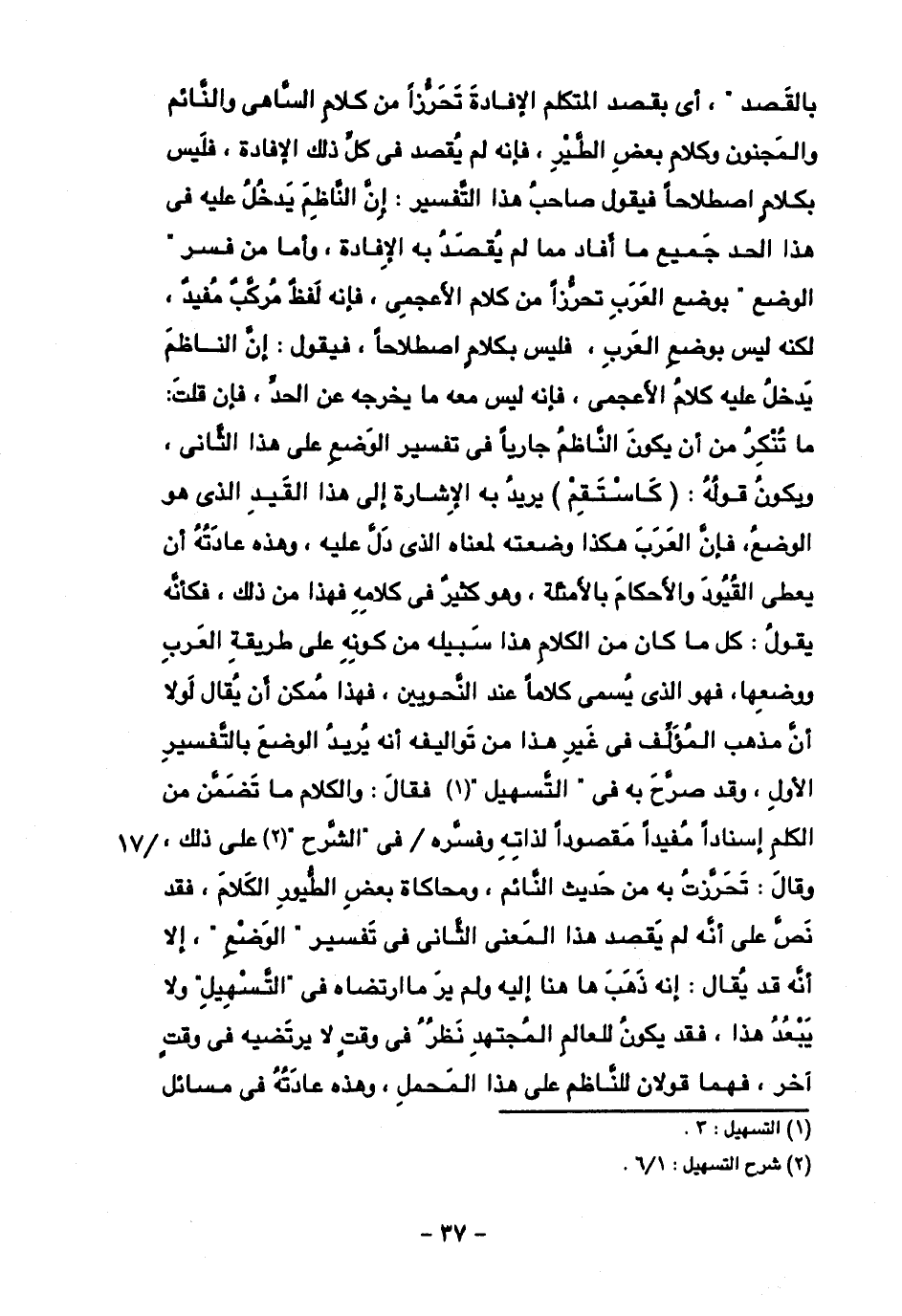 بالقصد"" أي يقصد المتكلم الإفادة تحرزا من كلام الساهي والنائم والمجنون وكلام بعض الطير، فإنه لم يقصد في كل ذلك الإفادة، فليس بكلام اصطلاحا فيقول صاحب هذا التفسير: إن الناظم يدخل عليه في هذا الحد جميع ما أفاد مما لم يقصد به الإفادة، وأما من فسر "الوضع" بوضع العرب تحرزا من كلام الأعجمي، فإنه لفظ مركب مفيد، لكنه ليس بوضع العرب، فليس بكلام اصطلاحا، فيقول: إن الناظم يدخل عليه كلام الأعجمي، فإنه ليس معه ما يخرجه عن الحد، فإن قلت: ما تنكر من أن يكون الناظم جاريا في تفسير الوضع على هذا الثاني، ويكون قوله: (كاستقم) يريد به الإشارة إلى هذا القيد الذي هو الوضع، فإن العرب هكذا وضعته لمعنا الذي دل عليه، وهذه عادته أن يعطى القيود والأحكام بالأمثلة، وهو كثير في كلامه فهذا من ذلك، فكأنه يقول: كل ما كان من الكلام هذا سبيله من كونه على طريقة العرب ووضعها، فهو الذي يسمى كلاما عند النحويين، فهذا ممكن أن يقال لولا أن مذهب المؤلف غير هذا من تواليفه أنه يريد الوضع بالتفسير الأول، وقد صرح به في "التسهيل" فقال: والكللم ما تضمن من الكلم إسنادا مفيدا مقصودا لذاته وفسره في "الشرح" على ذلك، وقال: تحرزت به من حديث النائم، ومحاكاة بعض الطيور الكلام، فقد نص على أنه لم يقصد هذا المعنى الثاني في تفسيره "الوضع" إلا أنه قد يقال: إنه ذهب ها هنا إليه ولم ير ما ارتضاه في "التسهيل" ولا يبعد هذا، فقد يكون للعالم المجتهد نظر في وقت لا يرتضيه في وقت آخر، فهما قولان للناظم على هذا المحمل، وهذه عادته في مسائل
