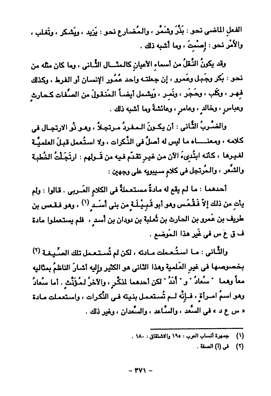 والثاني: ما استعملت مادته، لكن لم تستعمل تلك الصيغة بخصوصها في غير العلمية وهذا الثاني هو الكثير وإليه أشار الناظم بمثاليه معا وهما "سعاد" و "أدد" لكن أحدهما لمذكر، والآخر لمؤنث. أما سعاد وهو اسم امرأة، فإنه لم تستعمل بنيته في النكرات، واستعملت مادة "س ع د" في السعد، والساعد، والسعدان، وغير ذلك.