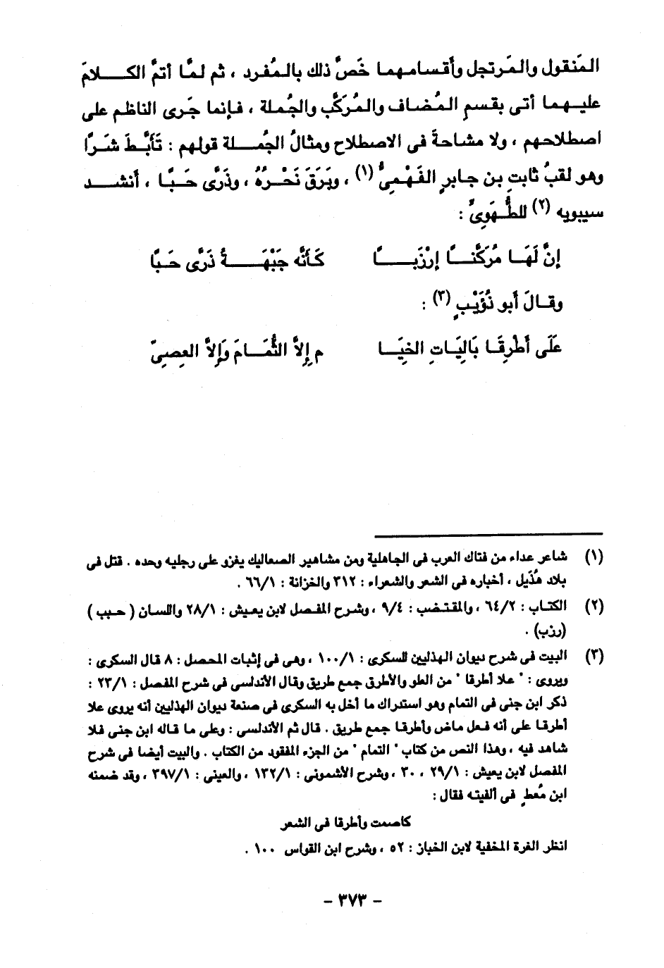 المنقول والمرتجل وأقسامهما خص ذلك بالمفرد، ثم لما أتم الكلام عليهما أتى بقسم المضاف والمركب والجملة، فإنما جرى الناظم على اصطلاحهم، ولا مشاحة في الاصطلاح ومثال الجملة قولهم: تأبط شرا وهو لقب ثابت بن جابر الفهمي، وبرق نحره، وذرى حبا، أنشد سيبويه للطهوي: