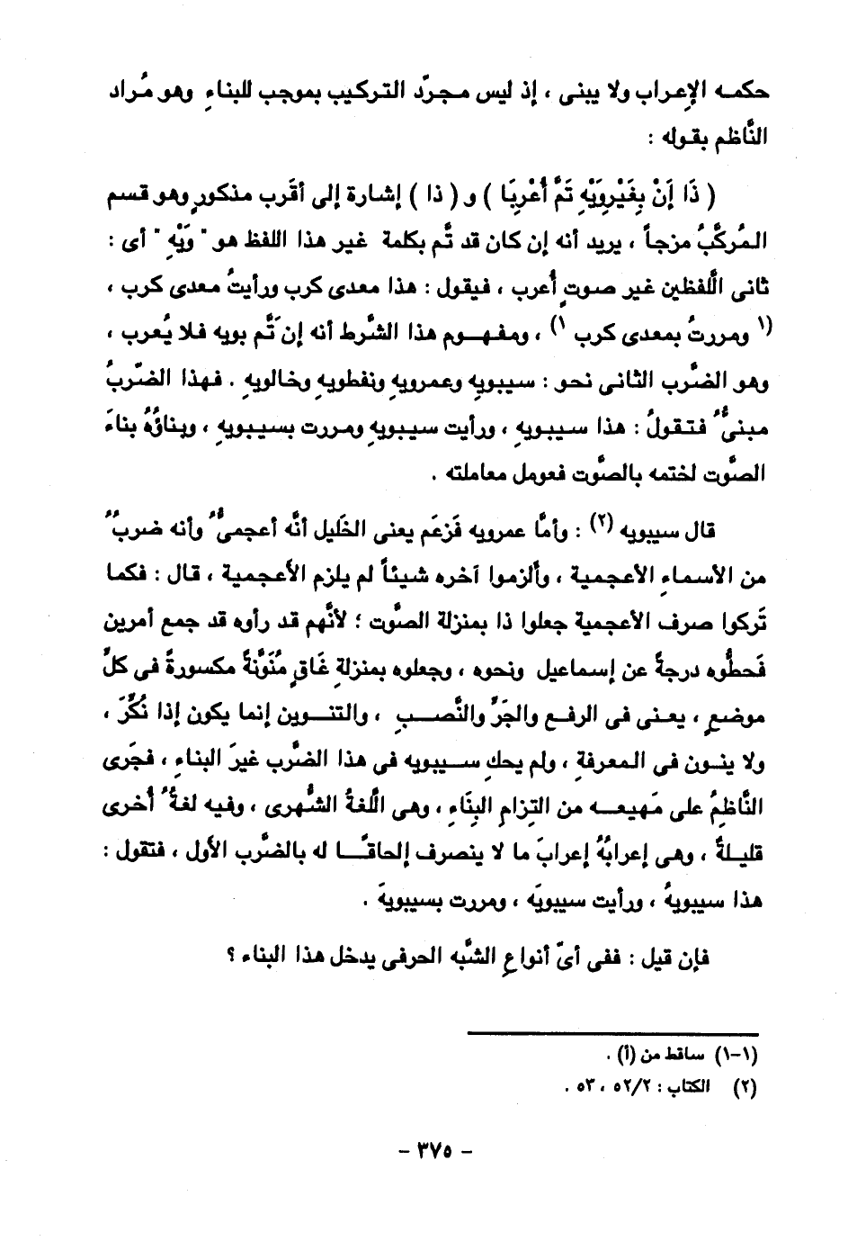 قال سيبويه: وأما عمرويه فزعم يعني الخليل أنه أعجمي وأنه ضرب من الأسماء الأعجمية، وألزموا آخره شيئا لم يلزم الأعجمية، قال: فكما تركوا صرف الأعجمية جعلوا ذا بمنزلة الصوت؛ لأنهم قد رأوه قد جمع أمرين فحطوه درجة عن إسماعيل ونحوه، وجعلوه بمنزلة غاق منونة مكسورة في كل موضع، يعني في الرفع والجر والنصب، والتنوين إنما يكون إذا نكر، ولا ينون في المعرفة، ولم يحك سيبويه في هذا الضرب غير البناء، فجرى الناظم على مهيعه من التزام البناء، وهي اللغة الشهرى، وفيه لغة أخرى قليلة، وهي إعرابه إعراب ما لا ينصرف إلحاقا له بالضرب الأول، فتقول: هذا سيبويه، ورأيت سيبويه، ومررت بسيبويه.