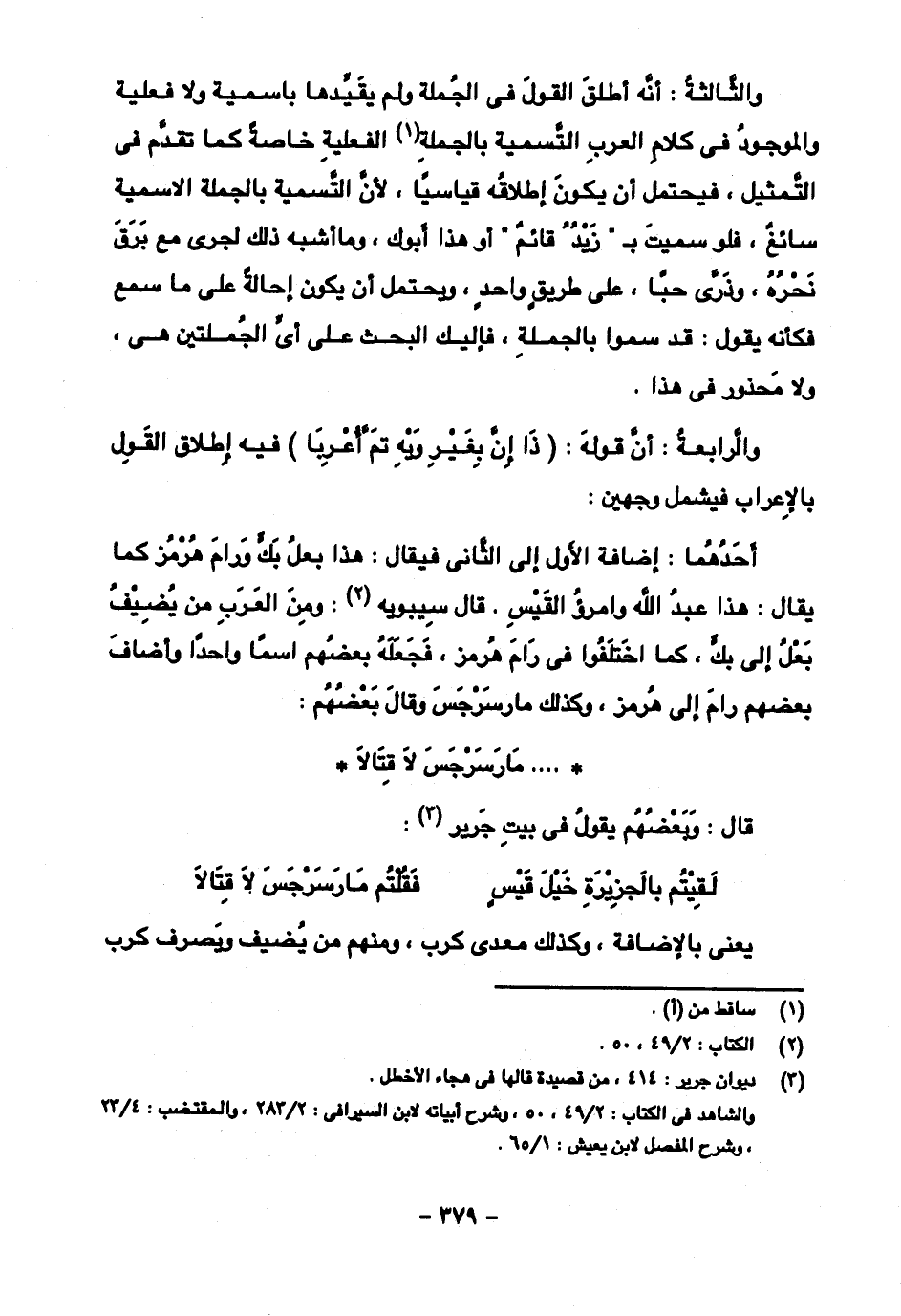 والثالثة: أنه أطلق القول في الجملة ولم يقيدها باسمية ولا فعلية والموجود في كلام العرب التسمية بالجملة الفعلية خاصة كما تقدم في التمثيل، فيحتمل أن يكون إطلاقه قياسيا، لأن التسمية بالجملة الاسمية سائغ، فلو سميت بـ "زيد قائم" أو هذا أبوك، وما أشبه ذلك لجرى مع برق نحره، وذرى حبا، على طريق واحد، ويحتمل أن يكون إحالة على ما سمع فكأنه يقول: قد سموا بالجملة، فإليك البحث على أي الجملتين هي، ولا محذور في هذا.