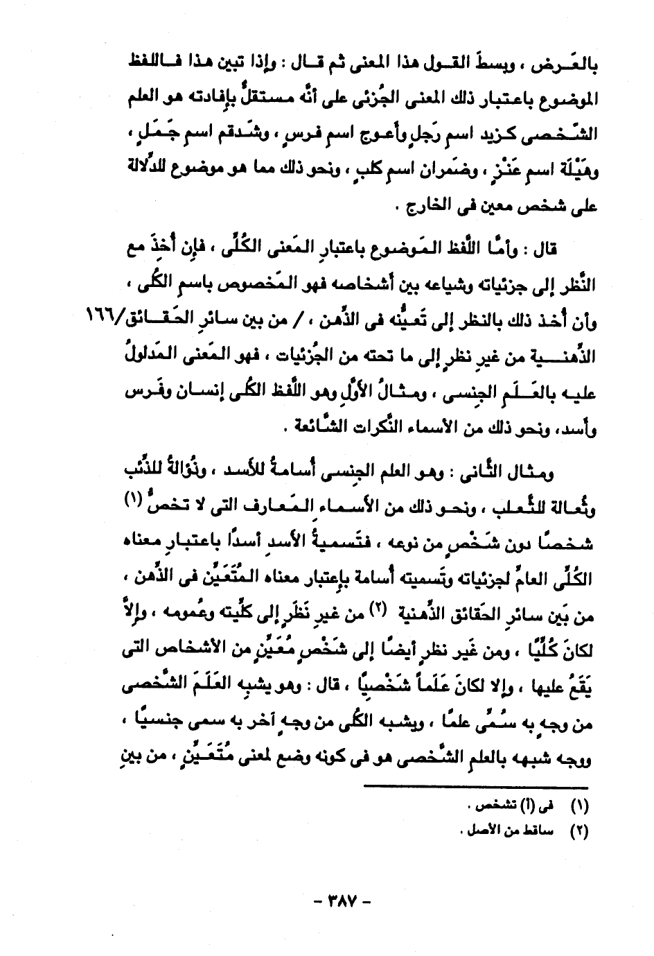 ومثال الثاني: وهو العلم الجنسي أسامة للأسد، وذؤالة للذئب وثعالة للثعلب، ونحو ذلك من الأسماء المعارف التي لا تخص شخصا دون شخص من نوعه، فتسمية الأسد أسدا باعتبار معنا الكلي العام لجزيئاته وتسميته أسامة باعتبار معناه المتعين في الذهن، من بين سائر الحقائق الذهنية من غير نظر إلى كليته وعمومه، وإلا لكان كليا، ومن غير نظر أيضا إلى شخص معين من الأشخاص التي يقع عليها، وإلا لكان علما شخصيا، قال: وهو يشبه العلم الشخصي من وجه به سمي علما، ويشبه الكلي من وجه آخر به سمي جنسيا، ووجه شبهه بالعلم الشخصي هو في كونه وضع لمعنى متعين، من بين