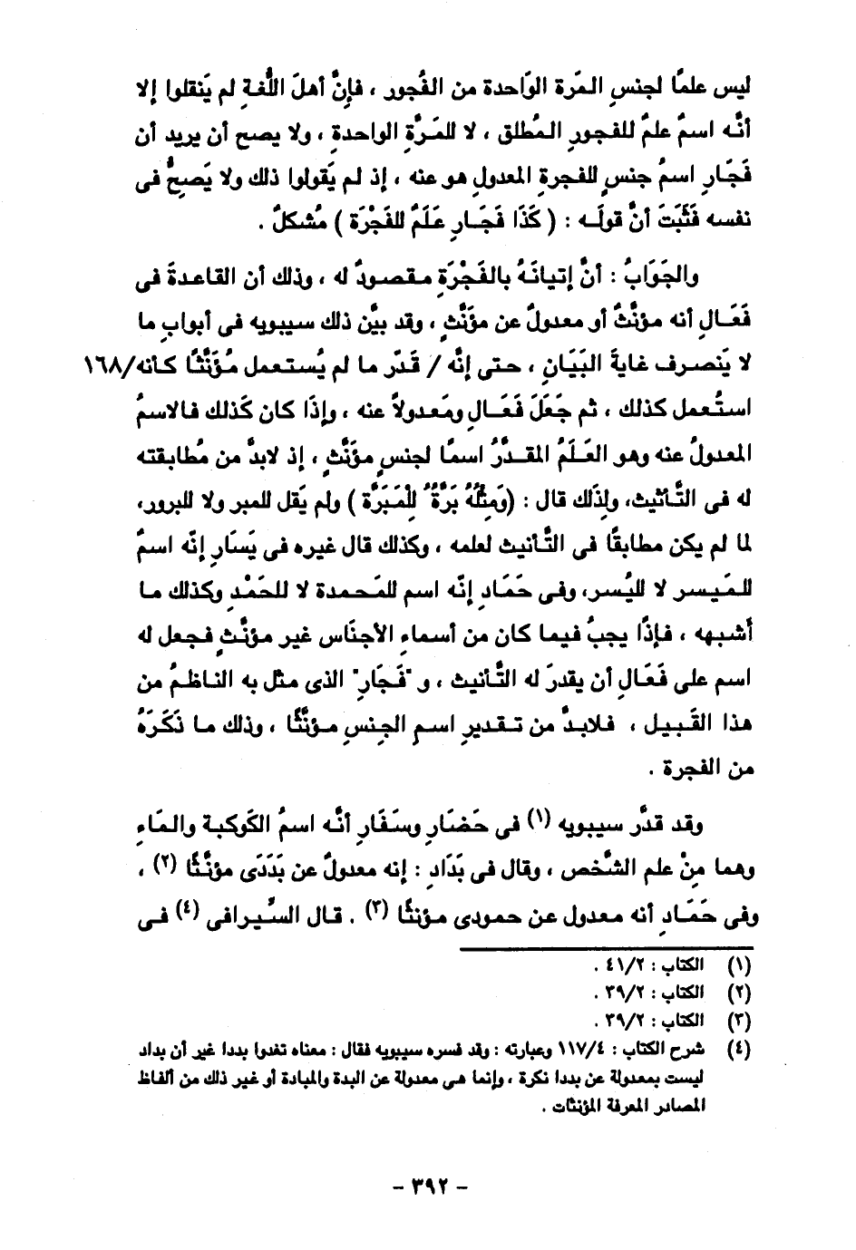 وقد قدر سيبويه في حضار وسفار أنه اسم الكوكبة والماء وهما من علم الشخص، وقال في بداد: إنه معدول عن بددي مؤنثا، وفي حماد أنه معدول عن حمودي مؤنثا. قال السيرافي في