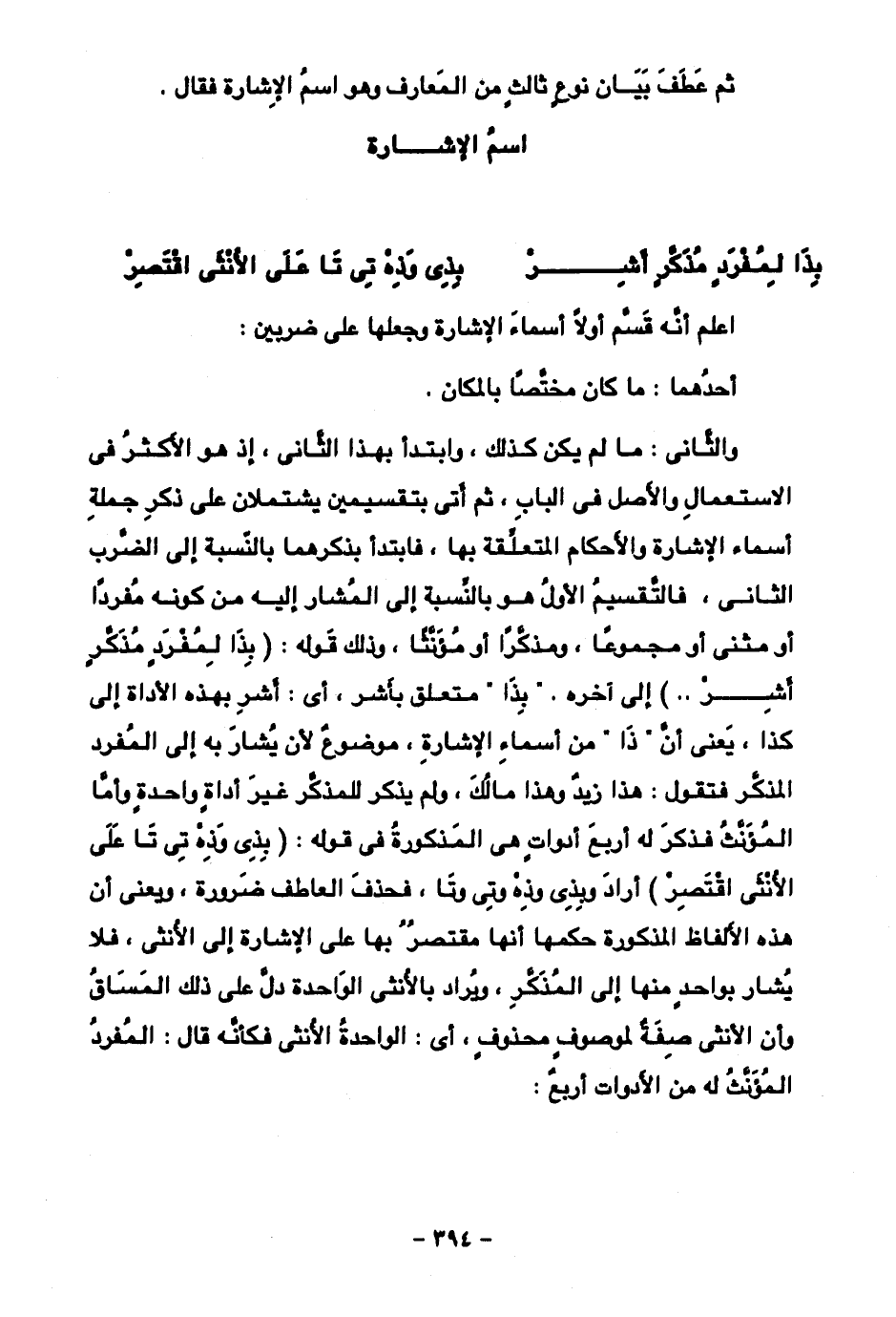 والثاني: ما لم يكن كذلك، وابتدأ بهذا الثاني، إذ هو الأكثر في الاستعمال والأصل في الباب، ثم أتى بتقسيمين يشتملان على ذكر جملة أسماء الإشارة والأحكام المتعلقة بها، فابتدأ بذكرهما بالنسبة إلى الضرب الثاني، فالتقسيم الأول هو بالنسبة إلى المشار إليه من كونه مفردا أو مثنى أو مجموعا، ومذكرا أو مؤنثا، وذلك قوله: (بذا لمفرد مذكر أشر .. ) إلى آخره. "بذا" متعلق بأشر، أي: أشر بهذه الأداة إلى كذا، يعني أن "ذا" من أسماء الإشارة، موضوع لأن يشار به إلى المفرد المذكر فتقول: هذا زيد وهذا مالك، ولم يذكر للمذكر غير أداة واحدة وأما المؤنث فذكر له أربع أدوات هي المذكورة في قوله: (بذي وذه تي تا على الأنثى اقتصر) أراد وبذي وذه وتي تا، فحذف العاطف ضرورة، ويعني أن هذه الألفاظ المذكورة حكمها أنها مقتصر بها على الإشارة إلى الأنثى، فلا يشار بواحد منها إلى المذكر، ويراد بالأنثى الواحدة دل على ذلك المساق وأن الأنثى صفة لموصوف محذوف، أي: الواحدة الأنثى فكأنه قال: المفرد المؤنث له من الأدوات أربع: