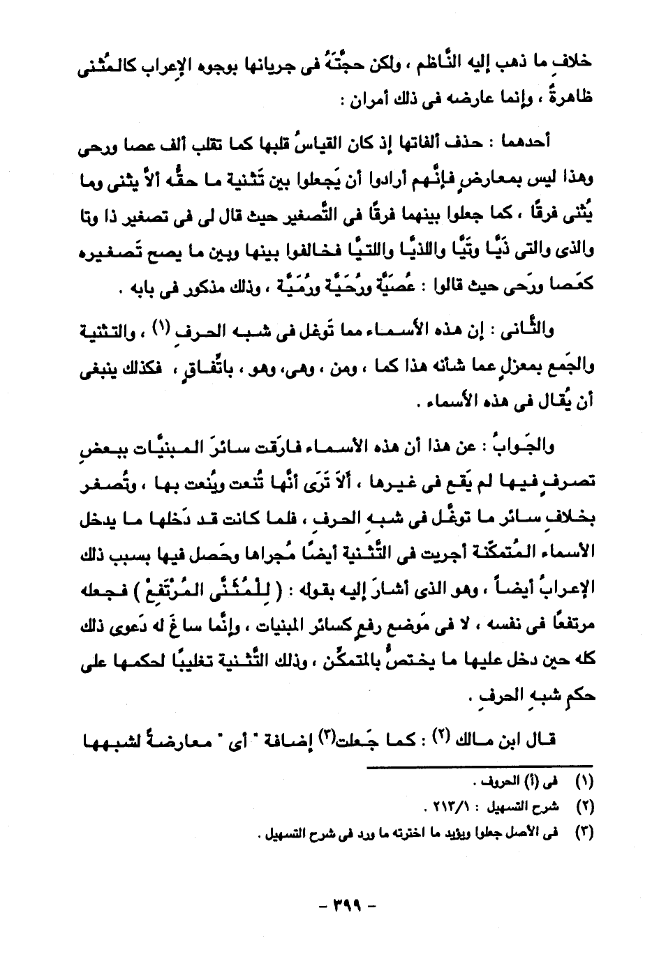 أحدهما: حذف ألفاتها إذ كان القياس قلبها كما تقلب ألف عصا ورحى وهذا ليس بمعارض فإنهم أرادوا أن يجعلوا بين تثنية ما حقه ألا يثنى وما يثنى فرقا، كما جعلوا بينهما فرقا في التصغير حيث قال لي في تصغير ذا وتا والذي والتي ذيا وتيا واللذيا واللتيا فخالفوا بينهما وبين ما يصح تصغيره كعصا ورحى حيث قالوا: عصية وروحية ورمية، وذلك مذكور في بابه.