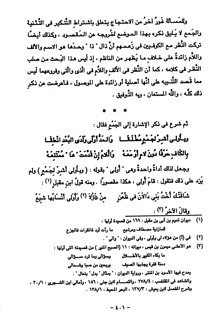 وجعل لذلك أداة واحدة وهي "أولى" بقوله: (وبأولى أشر لجمع) ولم يزد على ذلك فتقول: قام أولى، هكذا مقصورا. ومنه قول ابن مقبل: