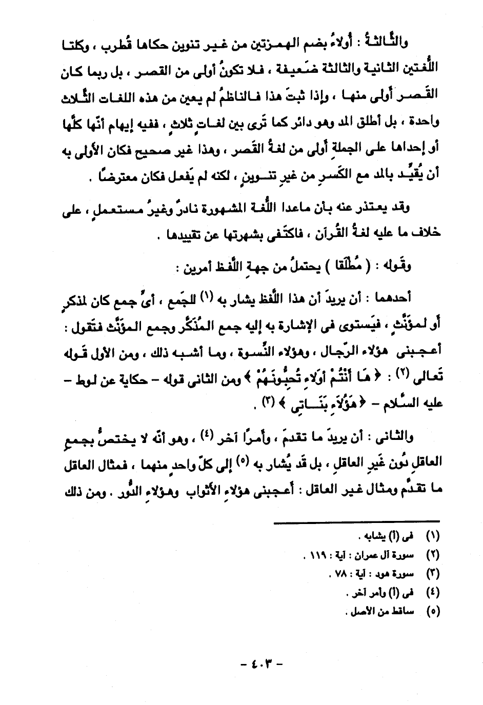 أحدهما: أن يريد أن هذا اللفظ يشار به للجمع، أي جمع كان لمذكر أو لمؤنث، فيستوي في الإشارة به إليه جمع المذكر وجمع المؤنث فتقول: أعجبني هؤلاء الرجال، وهؤلاء النسوة، وما أشبه ذلك، ومن الأول قوله تعالى: {ها أنتم أولاء تحبونهم} ومن الثاني قوله- حكاية عن لوط- عليه السلام- {هؤلاء بناتي}.