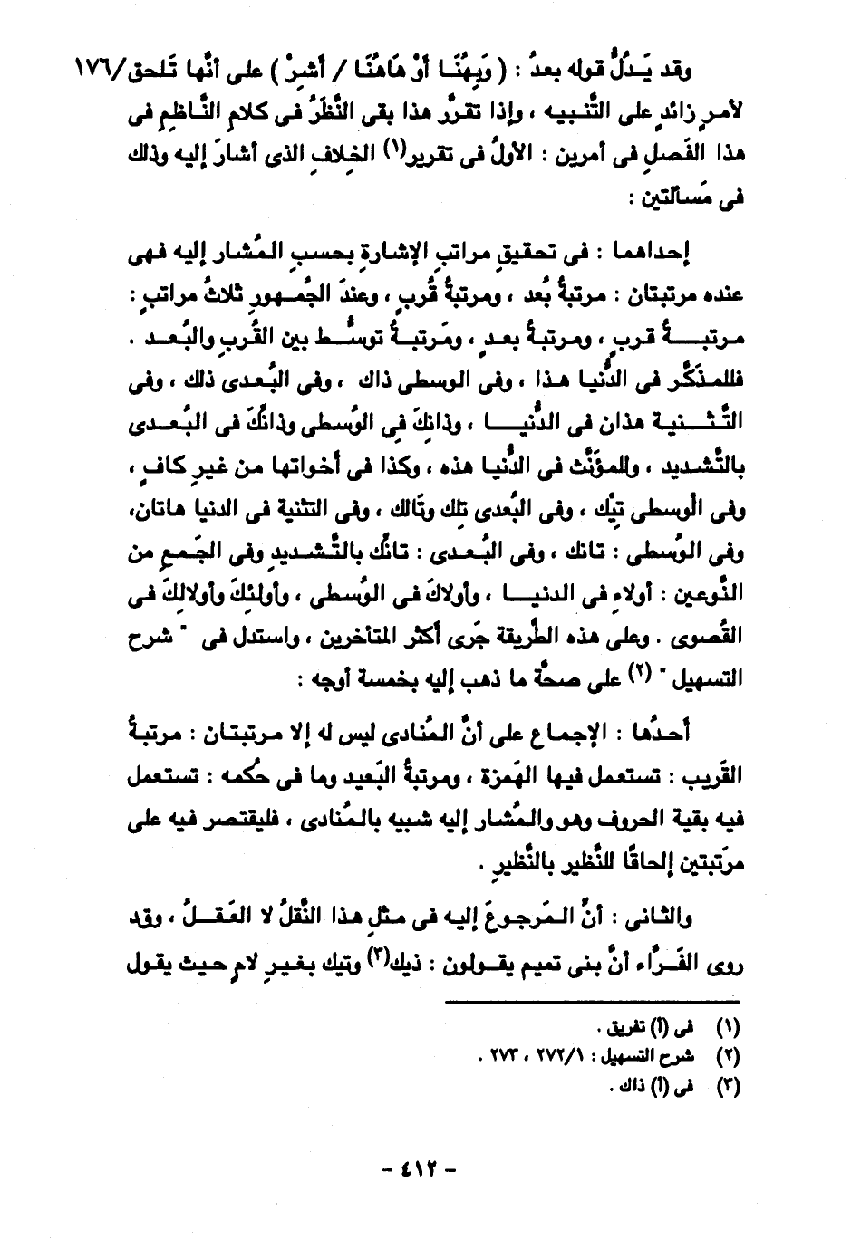 إحداهما: في تحقيق مراتب الإشارة بحسب المشار إليه فهي عنده مرتبتان: مرتبة بعد، ومرتبة قرب، وعند الجمهور ثلاث مراتب: مرتبة قرب، ومرتبة بعد، ومرتبة توسط بين القرب والبعد. فللمذكر في الدنيا هذا، وفي الوسطى ذاك، وفي البعدي ذلك، وفي التثنية هذان في الدنيا، وذانك في الوسطى وذانك في البعدي بالتشديد، وللمؤنث في الدنيا هذه، وكذا في أخواتها من غير كاف، وفي الوسطى تيك، وفي البعدي تلك وتالك، وفي التثنية في الدنيا هاتان، وفي الوسطى: تانك، وفي البعدي: تانك بالتشديد وفي الجمع من النوعين: أولاء في الدنيا، وأولاك في الوسطى، وأولئك وأولالك في القصوى. وعلى هذه الطريقة جرى أكثر المتأخرين، واستدل في "شرح التسهيل" على صحة ما ذهب إليه بخمسة أوجه: