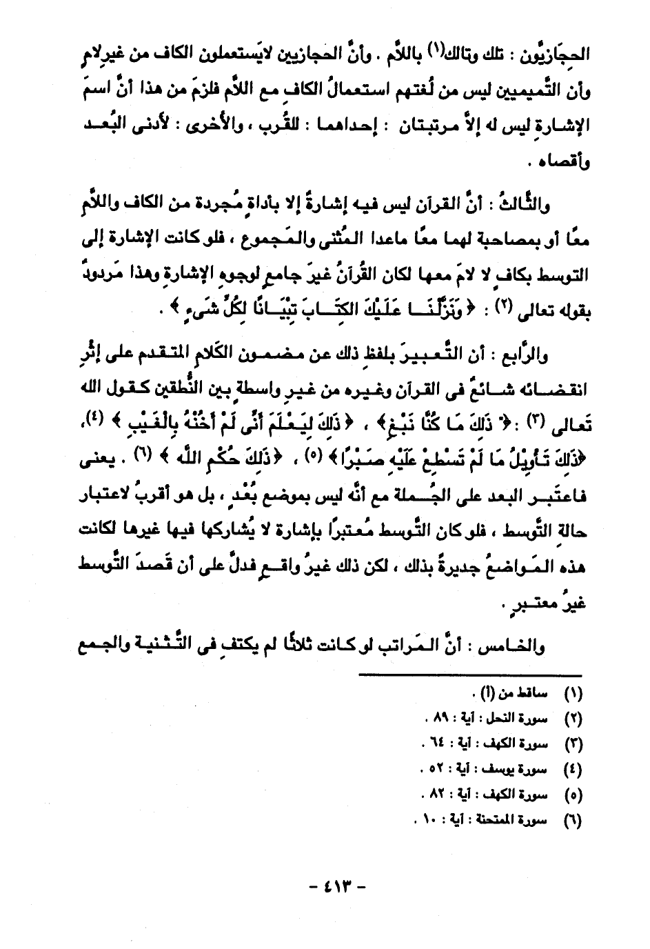 والثالث: أن القرآن ليس فيه إشارة إلا بأداة مجردة من الكاف واللام معا أو بمصاحبة لهما معا ما عدا المثنى والمجموع، فلو كانت الإشارة إلى التوسط بكاف لا لام معها لكان القرآن غير جامع لوجوه الإشارة وهذا مردود بقوله تعالى: {ونزلنا عليك الكتاب تبيانا لكل شيء}.