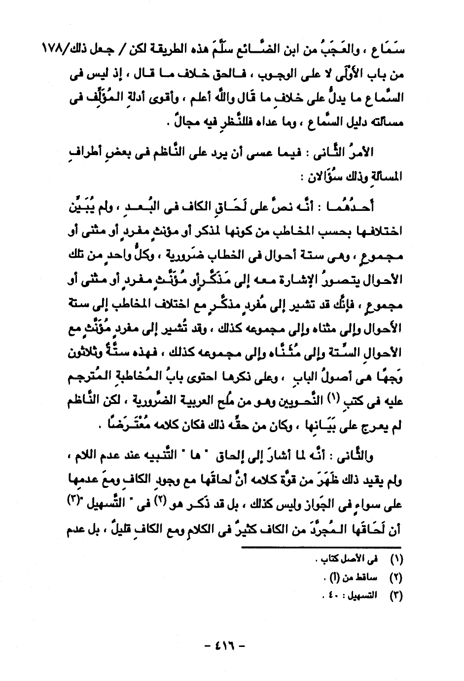 أحدهما: أنه نص على لحاق الكاف في البعد، ولم يبين اختلافها بحسب المخاطب من كونها لمذكر أو مؤنث مفرد أو مثنى أو مجموع، وهي ستة أحوال في الخطاب ضرورية، وكل واحد من تلك الأحوال يتصور الإشارة معه إلى مذكر أو مؤنث مفرد أو مثنى أو مجموع، فإنك قد تشير إلى مفرد مذكر مع اختلاف المخاطب إلى ستة الأحوال وإلى مثناه وإلى مجموعه كذلك، وقد تشير إلى مفرد مؤنث مع الأحوال الستة وإلى مثناه وإلى مجموعه كذلك، فهذه ستة وثلاثون وجها هي أصول الباب، وعلى ذكرها احتوى باب المخاطبة المترجم عليه في كتب النحويين وهو من ملح العربية الضرورية، لكن الناظم لم يعرج على بيانها، وكان من حقه ذلك فكان كلامه معترضا.