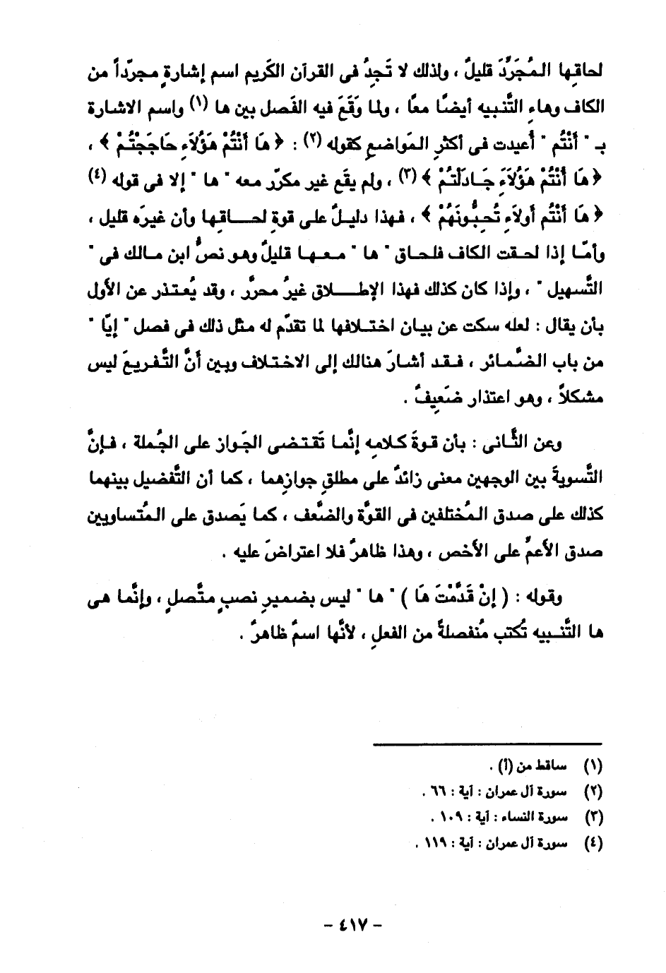 لحاقها المجرد قليل، ولذلك لا تجد في القرآن الكريم اسم إشارة مجردا من الكاف وهاء التنبيه أيضا معا، ولما وقع فيه الفصل بين ها واسم الإشارة بـ "أنتم" أعيدت في أكثر المواضع كقوله: {ها أنتم هؤلاء حاججتم}، {ها أنتم هؤلاء جادلتم}، ولم يقع غير مكرر معه "ها" إلا في قوله {ها أنتم أولاء تحبونهم}، فهذا دليل على قوة لحاقها وأن غيره قليل، وأما إذا لحقت الكاف فلحاق "ها" معها قليل وهو نص ابن مالك في "التسهيل"، وإذا كان كذلك فهذا الإطلاق غير محرر، وقد يعتر عن الأول بأن يقال: لعله سكت عن بيان اختلافها لما تقدم له مثل ذلك في فصل "إيا" من باب الضمائر، فقد أشار هنالك إلى الاختلاف وبين أن التفريع ليس مشكلا، وهو اعتذار ضعيف.